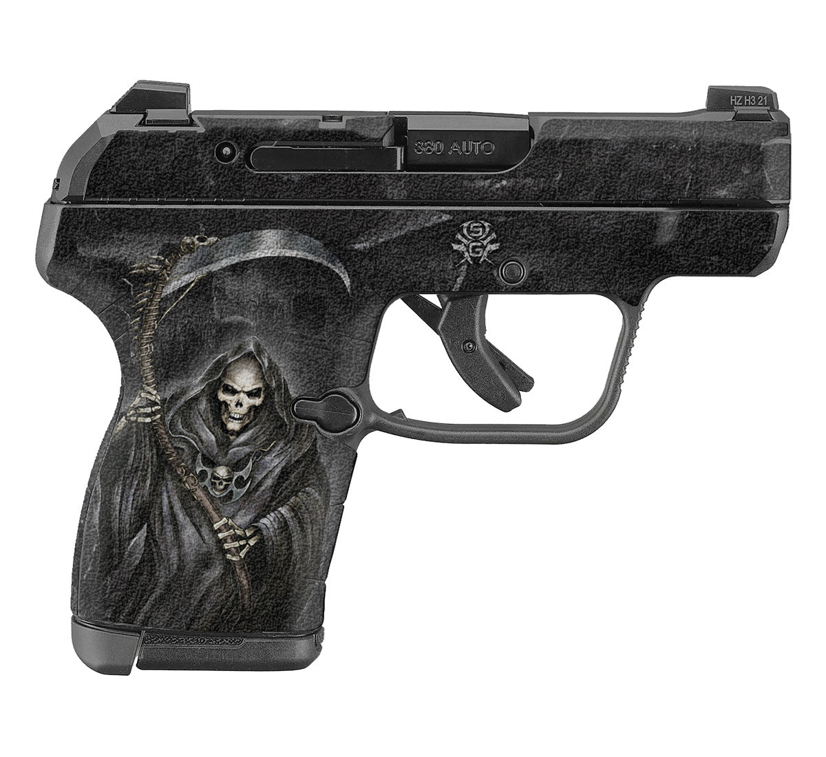 Ruger LCP Max Decal Grip – Showgun decal grips are manufactured with a rubberized, textured vinyl. The rubber-like feel is not only non-slip, but it won’t chaff or irritate your skin. Made with 3M adhesive that is specially formulated to mold into textured surfaces and stay on through harsh conditions. Cover just the frame of your LCP Max or apply it to the slide as well. Grim Reaper design.