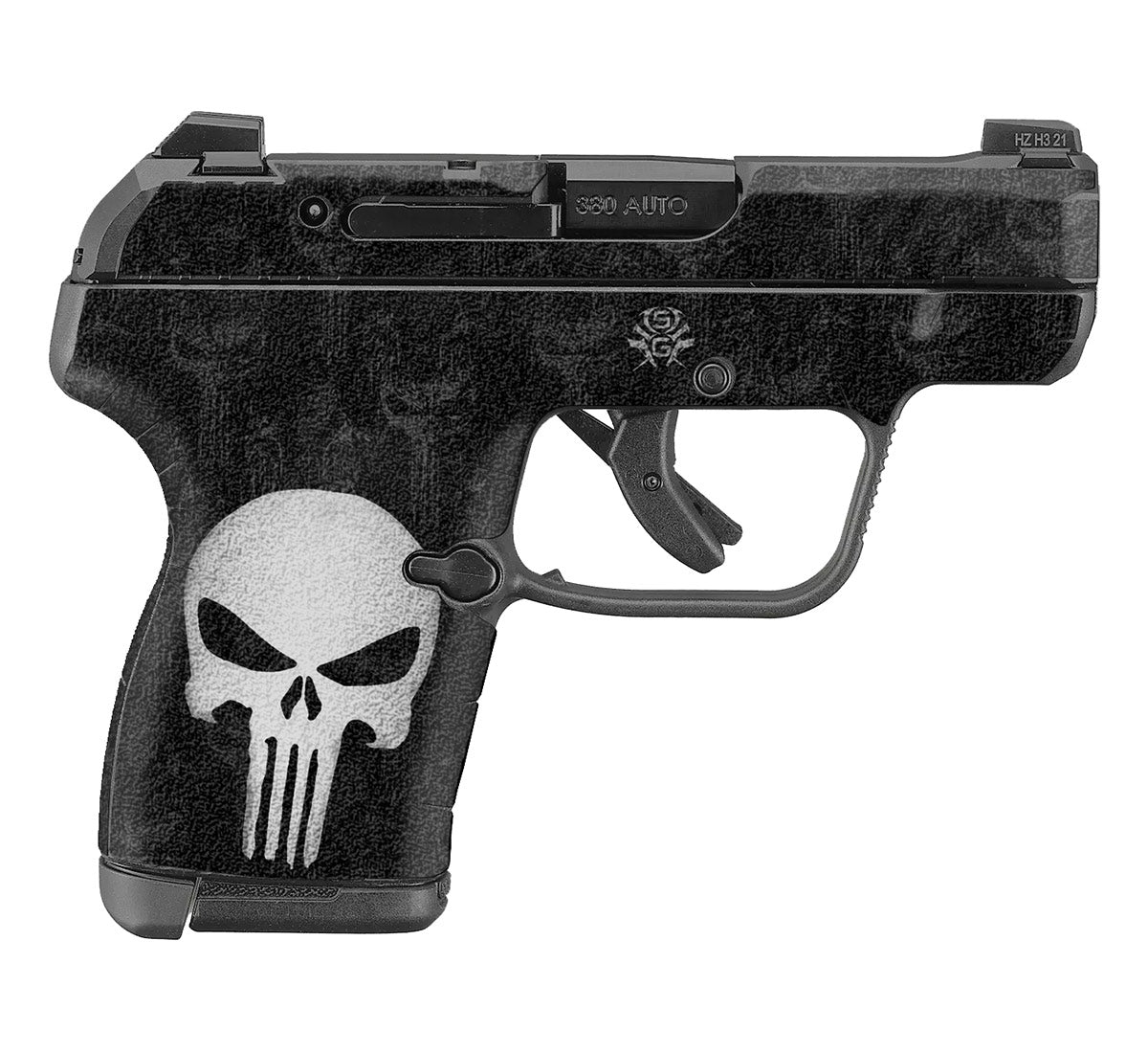 Ruger LCP Max Decal Grip – Showgun decal grips are manufactured with a rubberized, textured vinyl. The rubber-like feel is not only non-slip, but it won’t chaff or irritate your skin. Made with 3M adhesive that is specially formulated to mold into textured surfaces and stay on through harsh conditions. Cover just the frame of your LCP Max or apply it to the slide as well. Punisher design.