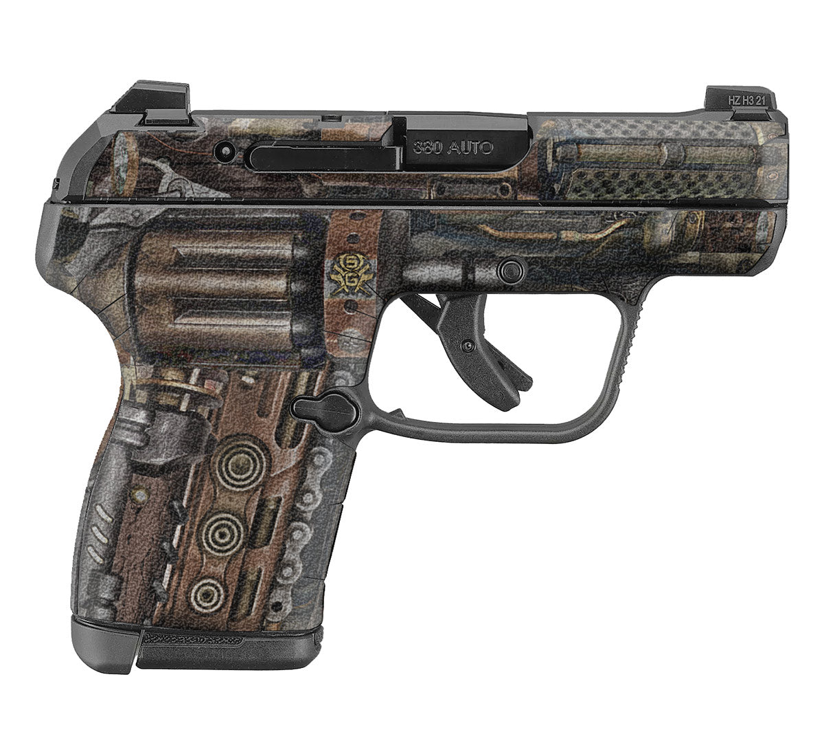 Ruger LCP Max Decal Grip – Showgun decal grips are manufactured with a rubberized, textured vinyl. The rubber-like feel is not only non-slip, but it won’t chaff or irritate your skin. Made with 3M adhesive that is specially formulated to mold into textured surfaces and stay on through harsh conditions. Cover just the frame of your LCP Max or apply it to the slide as well. Steampunk design.