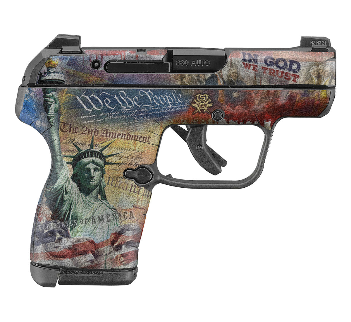 Ruger LCP Max Decal Grip – Showgun decal grips are manufactured with a rubberized, textured vinyl. The rubber-like feel is not only non-slip, but it won’t chaff or irritate your skin. Made with 3M adhesive that is specially formulated to mold into textured surfaces and stay on through harsh conditions. Cover just the frame of your LCP Max or apply it to the slide as well. We The People design.