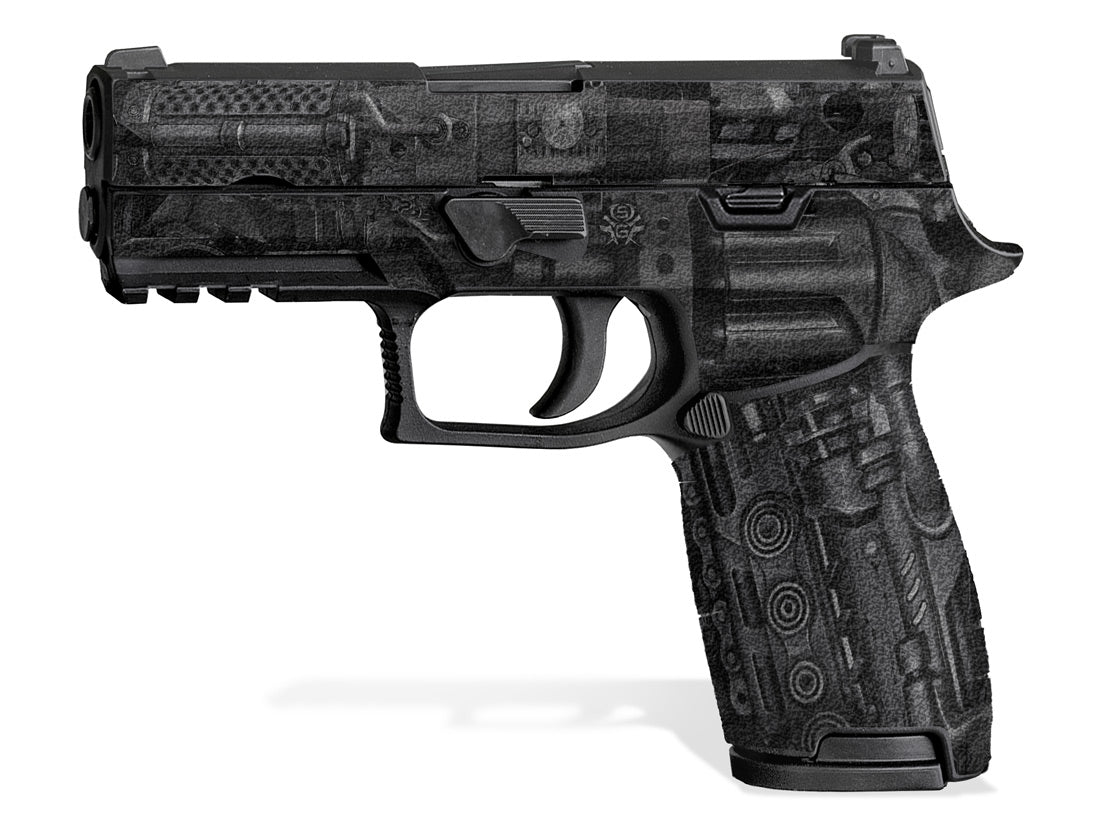 Decal Grip for Sig P320 Carry and Compact models (see below). Manufactured with a rubberized, textured, non-slip vinyl that gives you a firm secure grip and won’t chaff or irritate your skin. Made with 3M adhesive specially formulated to mold into textured surfaces to stay on through harsh conditions. Cover just the frame of your P320 Compact/Carry or apply it to the slide as well. Steampunk design.