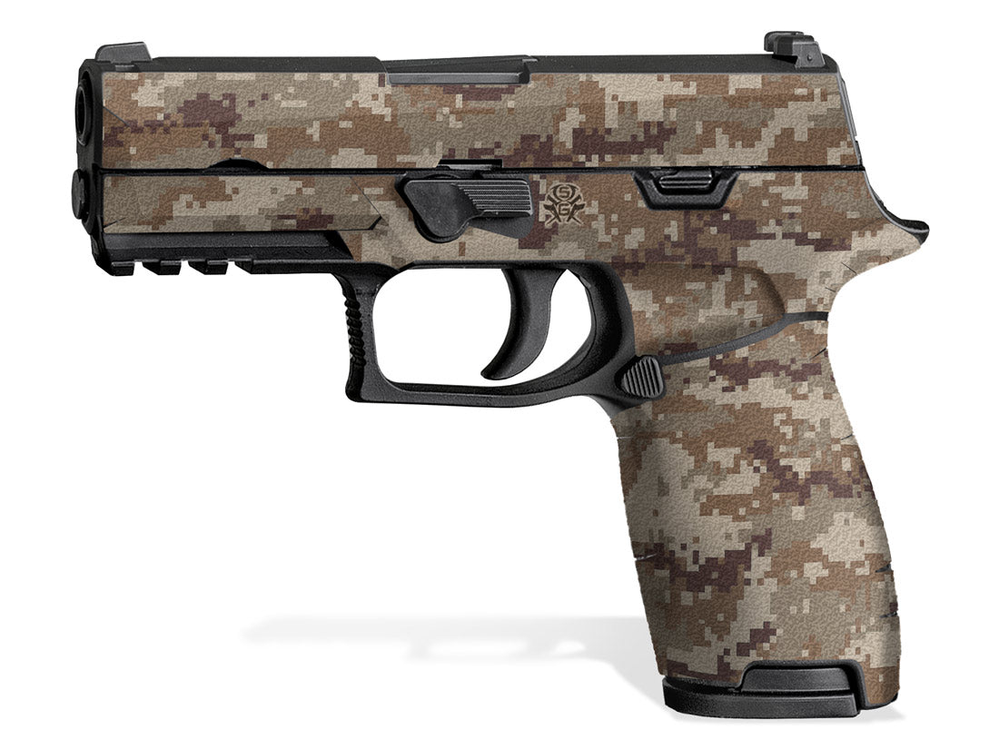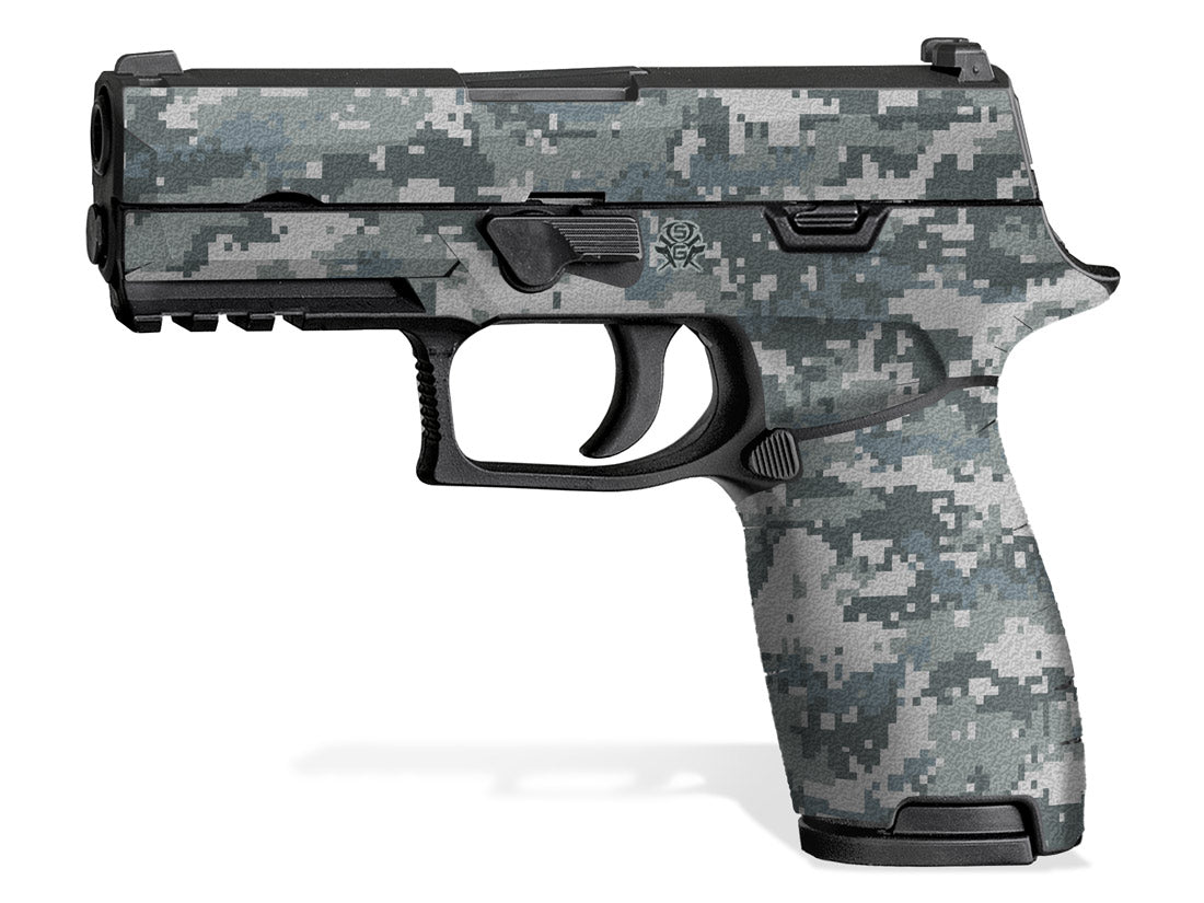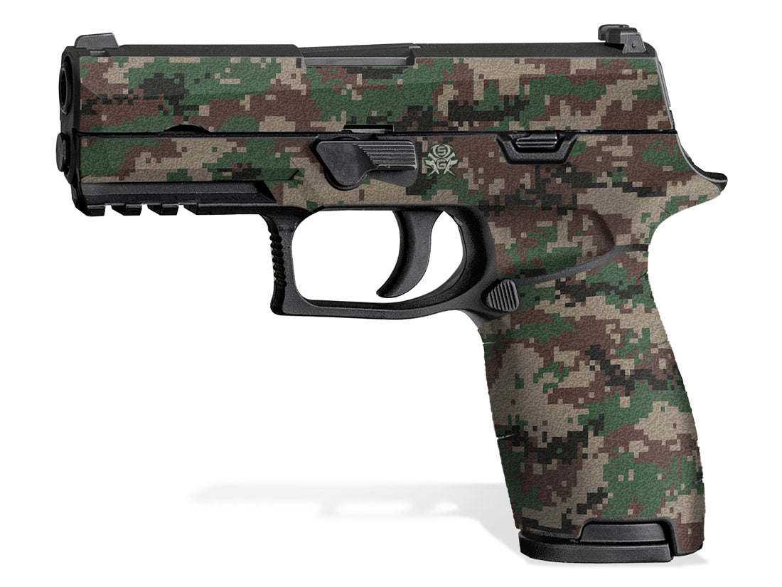 Decal Grip for Sig P320 Carry and Compact models (see below). Manufactured with a rubberized, textured, non-slip vinyl that gives you a firm secure grip and won’t chaff or irritate your skin. Made with 3M adhesive specially formulated to mold into textured surfaces to stay on through harsh conditions. Cover just the frame of your P320 Compact/Carry or apply it to the slide as well.  Digital Camo design.