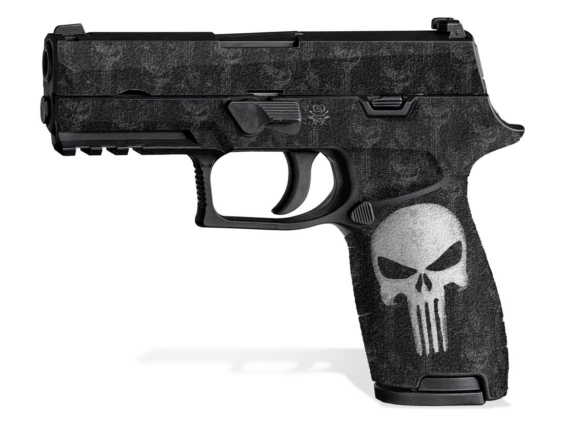 Decal Grip for Sig P320 Carry and Compact models (see below). Manufactured with a rubberized, textured, non-slip vinyl that gives you a firm secure grip and won’t chaff or irritate your skin. Made with 3M adhesive specially formulated to mold into textured surfaces to stay on through harsh conditions. Cover just the frame of your P320 Compact/Carry or apply it to the slide as well.  The Punisher design.