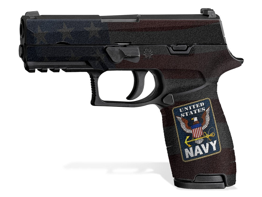 Decal Grip Kit for Sig P320 Compact. Features an amazing rubber-like, textured grip surface for better grip and more control. Cover just the frame or apply it to the slide as well. US Navy design.