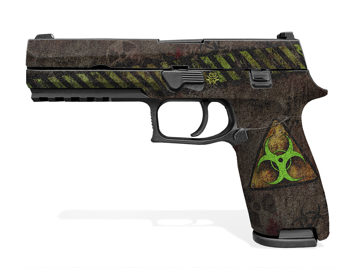 Showgun decal grips are manufactured with a rubberized, textured vinyl. The rubber-like feel is not only non-slip, but it won’t chaff or irritate your skin. Made with 3M adhesive that is specially formulated to mold into textured surfaces and stay on through harsh conditions. Cover just the frame of your Full-Size P320 or apply it to the slide as well. Biohazard design.