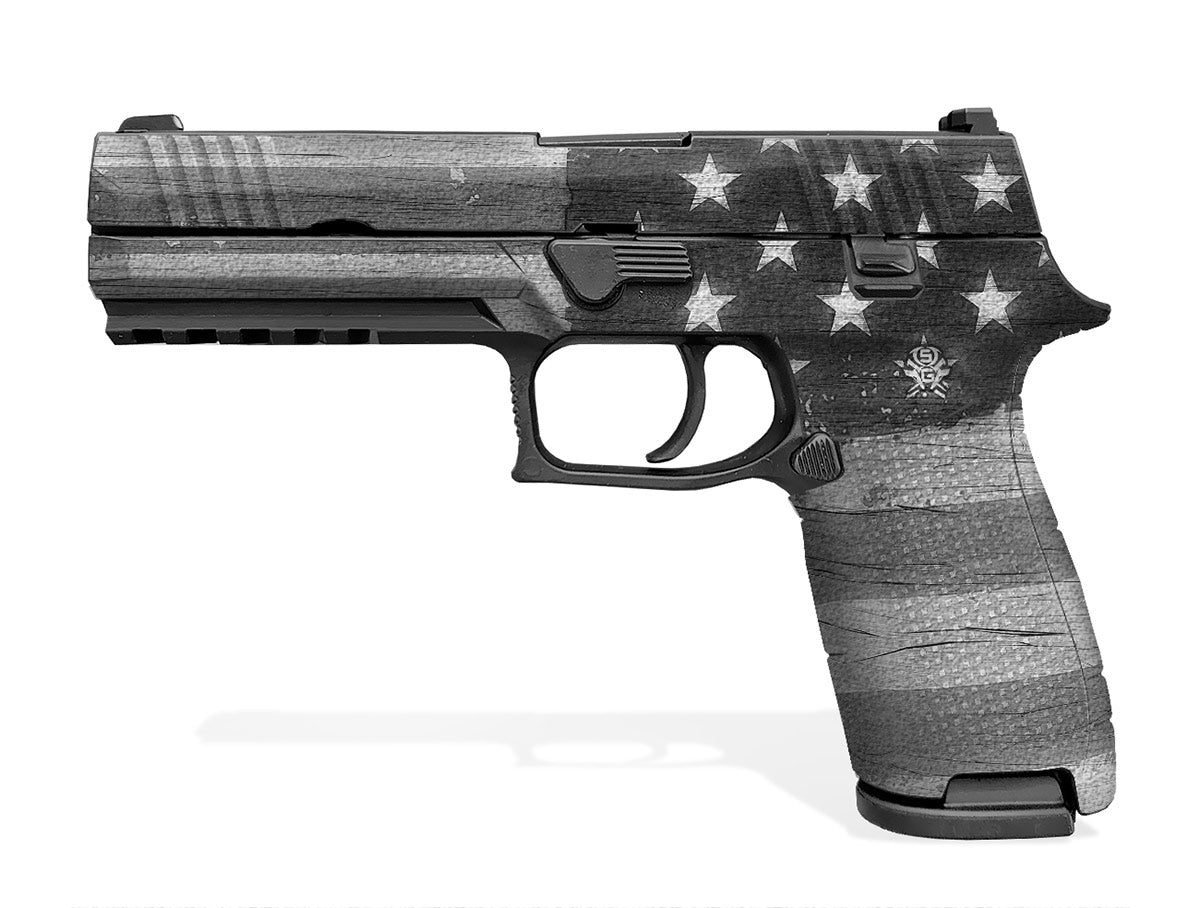 Decal Grip for Full-Size Sig P320 – Showgun decal grips are manufactured with a rubberized, textured vinyl and 3M adhesive specially formulated to mold into textured surfaces and stays on through harsh environments and conditions. Cover just the frame of your Full-Size P320 or apply it to the slide as well. The rubber-like feel is not only non-slip, but it won’t chaff or irritate your skin. Subdued Flag design.