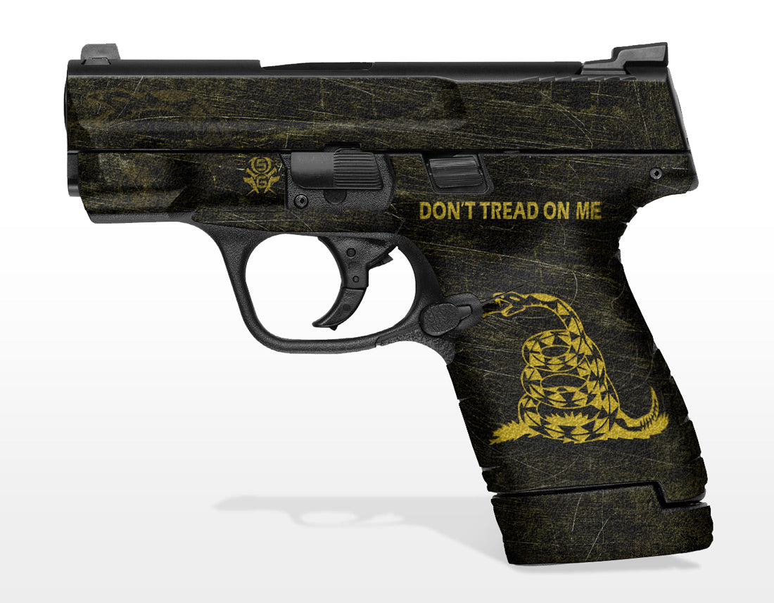 Decal Grip Kit for S&W M&P Shield, 9mm and .40. Features an amazing rubber-like, textured grip surface for better grip and more control. Cover just the frame or apply it to the slide as well. Don’t Tread On Me design.