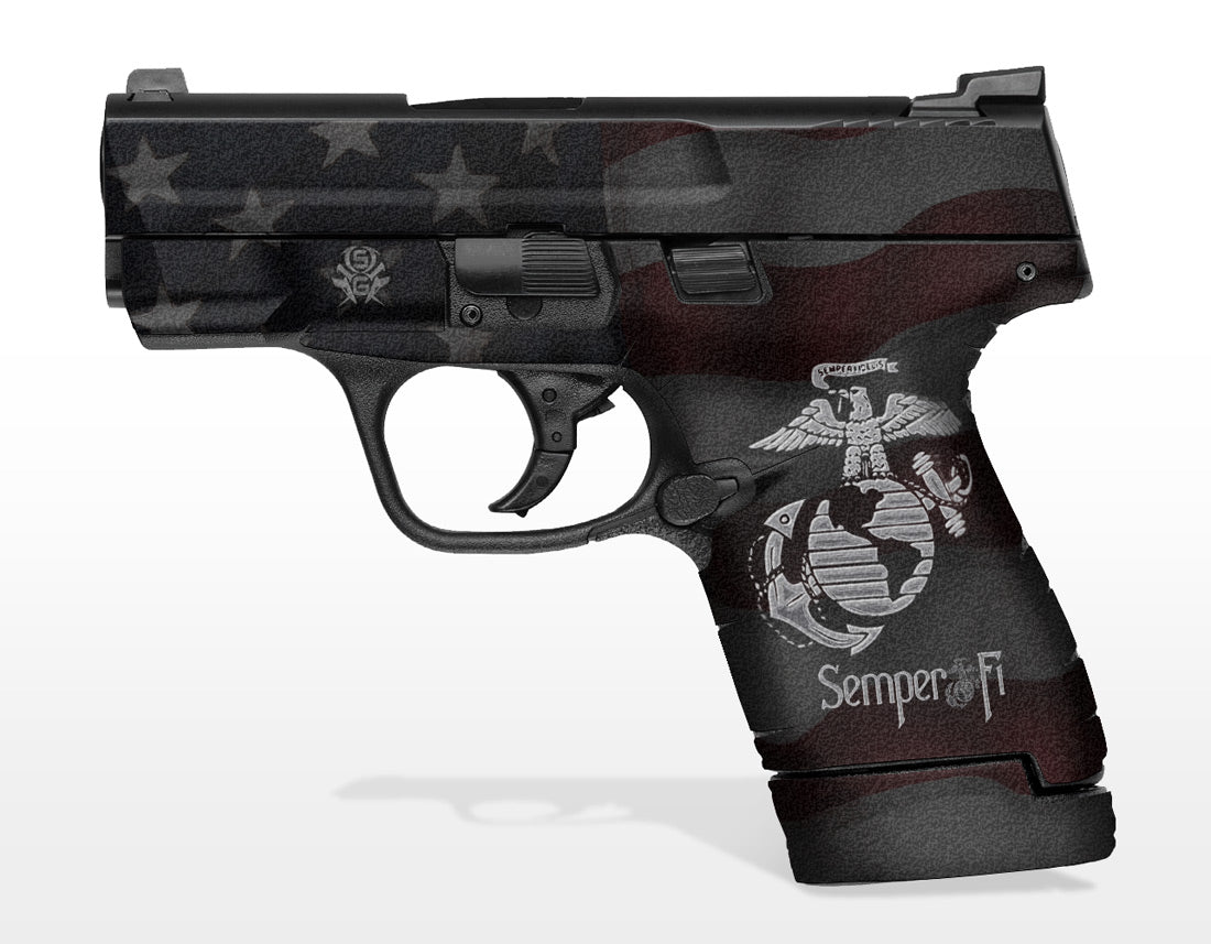 Decal Grip for Smith & Wesson M&P Shield, 9mm and .40. Features an amazing rubber-like, textured grip surface for better grip and more control. Cover just the frame or apply it to the slide as well. Semper Fi design.