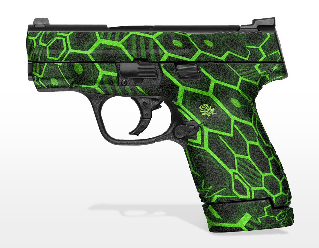Decal Grip for Smith & Wesson M&P Shield, 9mm and .40. Features an amazing rubber-like, textured grip surface for better grip and more control. Cover just the frame or apply it to the slide as well. Space Hex design.