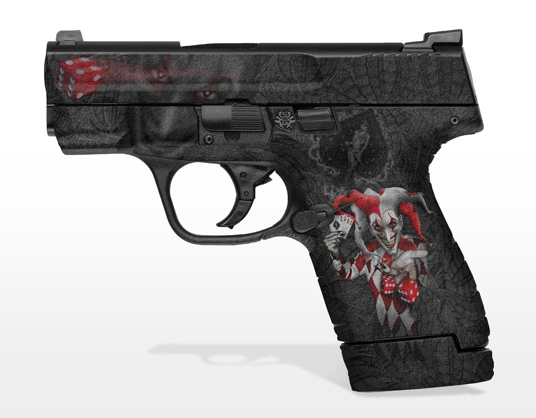 Decal Grip for Smith & Wesson M&P Shield, 9mm and .40. Features an amazing rubber-like, textured grip surface for better grip and more control. Cover just the frame or apply it to the slide as well. The Joker design by Invision Artworks.