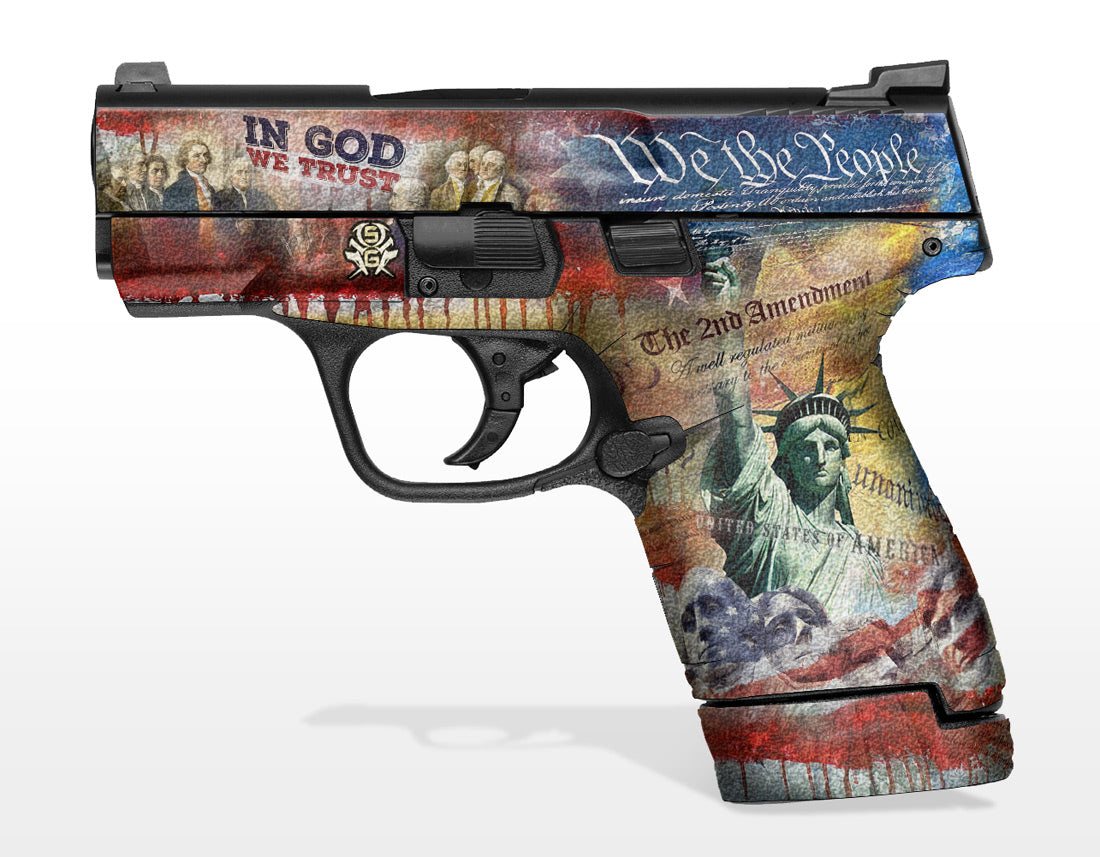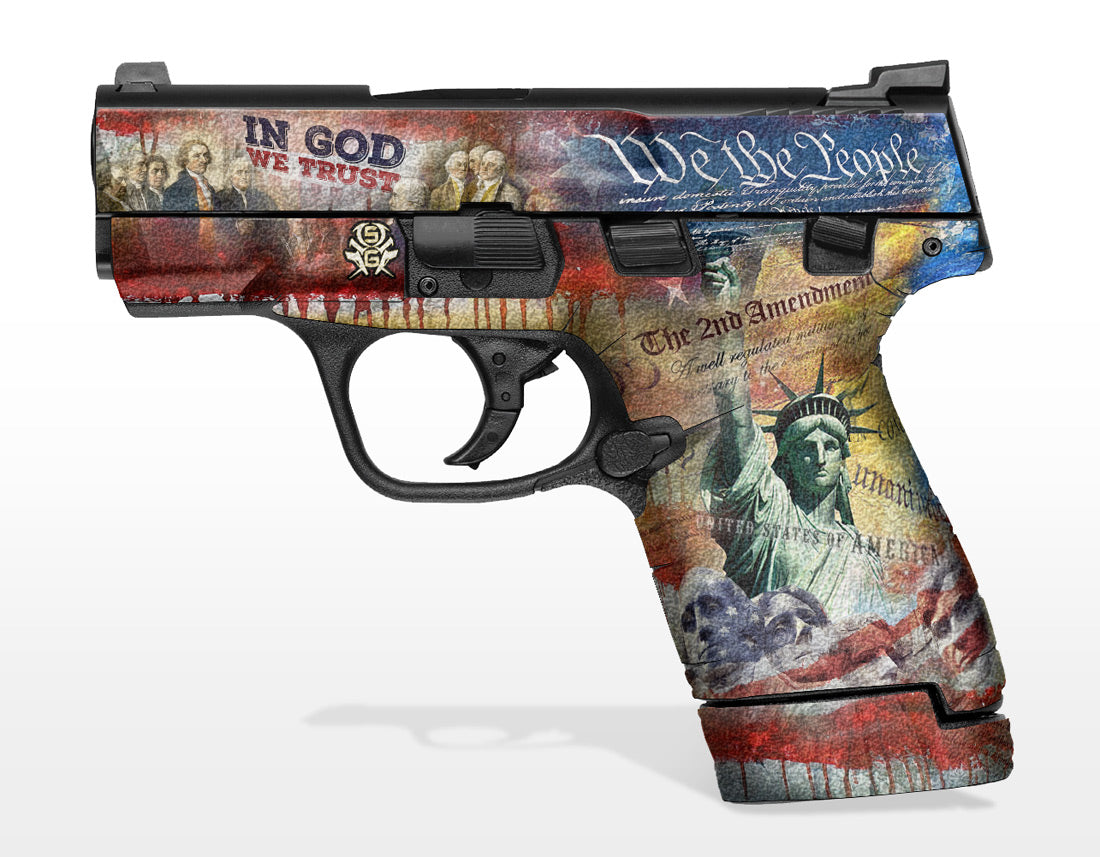 Decal Grip for Smith & Wesson M&P Shield, 9mm and .40. Features an amazing rubber-like, textured grip surface for better grip and more control. Cover just the frame or apply it to the slide as well. We The People design.