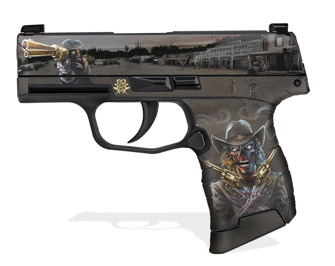 Decal Grip for Smith & Wesson SD9, SD9VE, SD40 & SD40VE. Features an amazing rubber-like, textured grip surface for better grip and more control. Cover just the frame or apply it to the slide as well. Zombie Outlaw design.