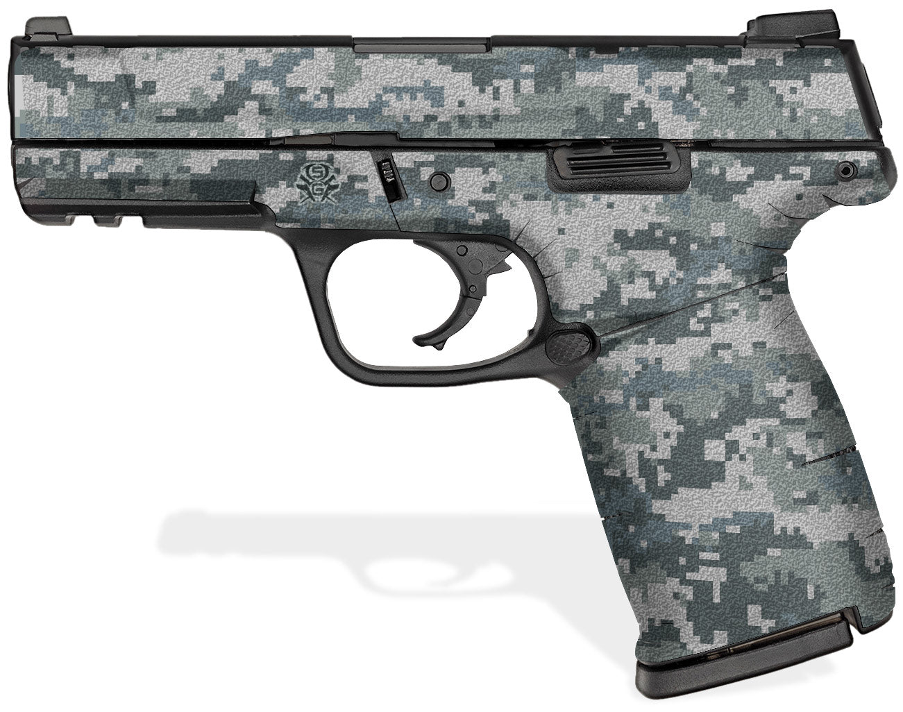 Showgun decal grips are manufactured with a rubberized, textured vinyl, and 3M adhesive specifically formulated to mold into textured surfaces and stay on through harsh environments and conditions. Cover just the frame or apply it to the slide as well. The rubberized feel is not only non-slip, but it won’t chaff or irritate your skin. Digital Camo in Army Green design available here, templated to fit over 40 gun models (see below).