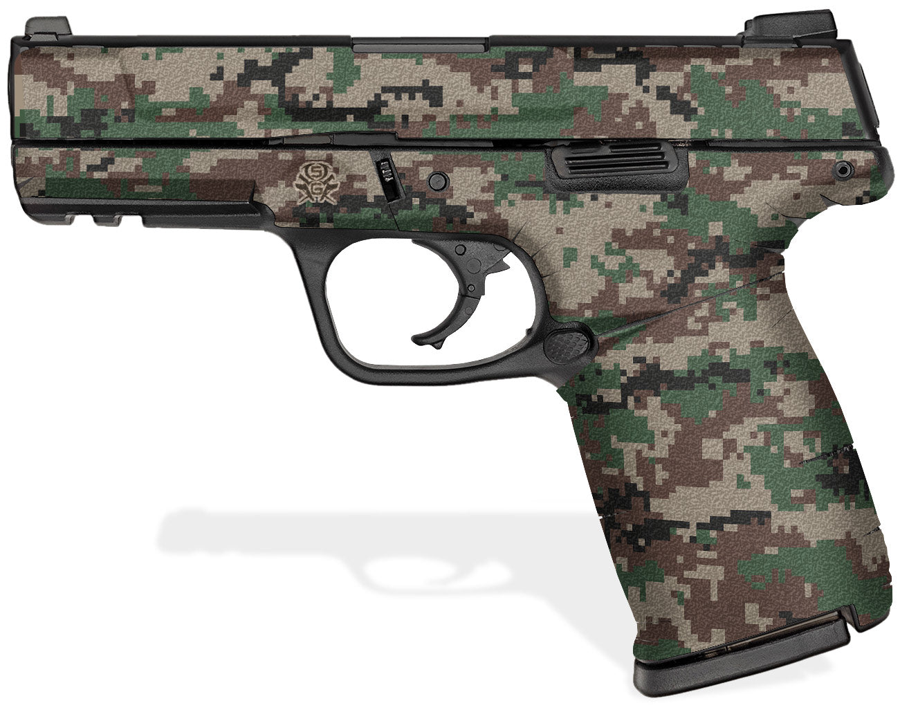 Showgun decal grips are manufactured with a rubberized, textured vinyl, and 3M adhesive specifically formulated to mold into textured surfaces and stay on through harsh environments and conditions. Cover just the frame or apply it to the slide as well. The rubberized feel is not only non-slip, but it won’t chaff or irritate your skin. Digital Camo in Marine Corps Woodland design available here, templated to fit over 40 gun models (see below).