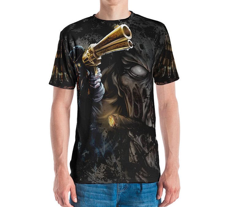 Zombie Outlaw design by Invision Artworks on a premium quality T-Shirt, made of smooth, comfortable cotton-touch polyester that will not fade from washing. Each t-shirt is sublimation printed, cut, and hand-sewn.