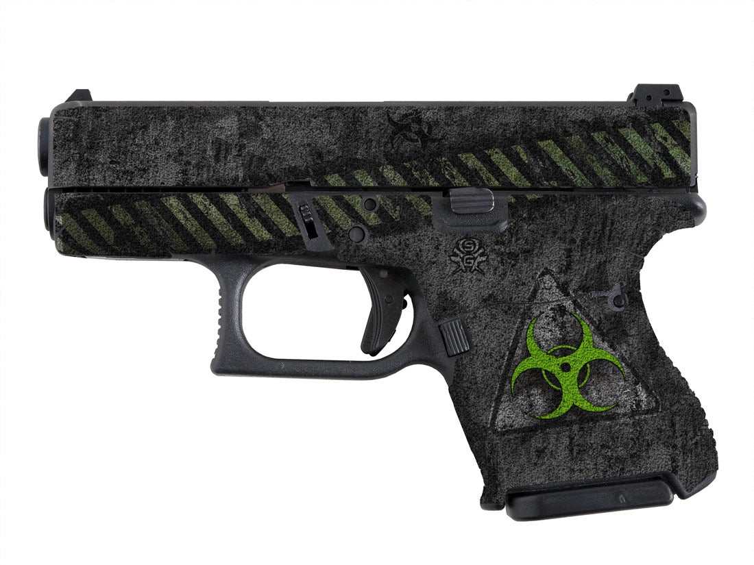 Decal Grip Kit for Glock 26 – Biohazard design. Provides a better grip on the short frame of the G26, giving you more control. Features a textured, rubber-like grip surface. Cover just the frame or add grip the slide as well. Now Available for Glock 26 Gen 5.