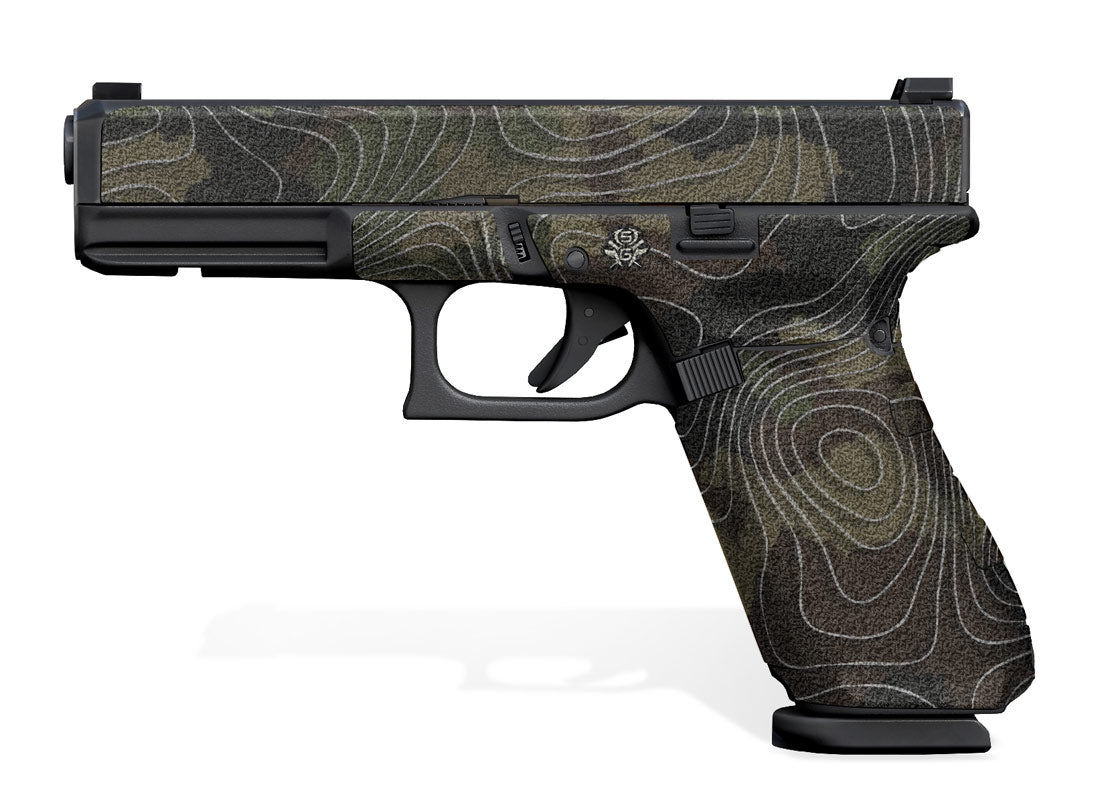 Decal Grip for Gen 5 Glock 17. Topo Camo design. Features a textured, rubber-like surface to give you a better grip and more control of the firearm. Cover just your G17 frame or add grip and design to your slide as well.