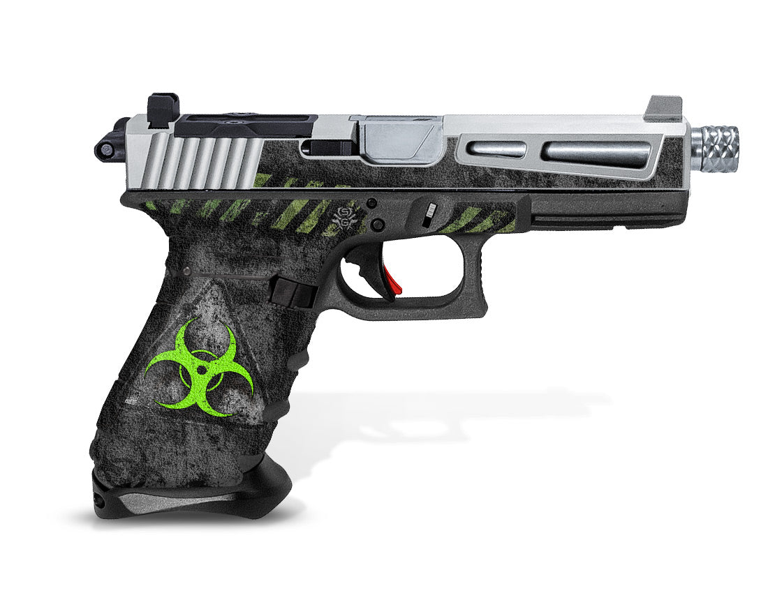 Decal Grip Kit for Glock Gen 3, G17 – Features Biohazard artwork and a textured, rubber-like grip surface to give you a better grip and more control of your firearm. Cover just the frame of your Glock 17 or add grip and style to the slide as well.
