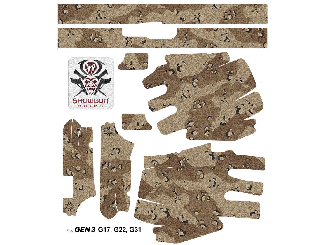Decal Grip  for Gen 3 Glock 17 – Desert Camo – Features a textured, rubber-like grip surface to give you a better grip and more control of your firearm. Cover just the frame or add grip and design to the slide as well.