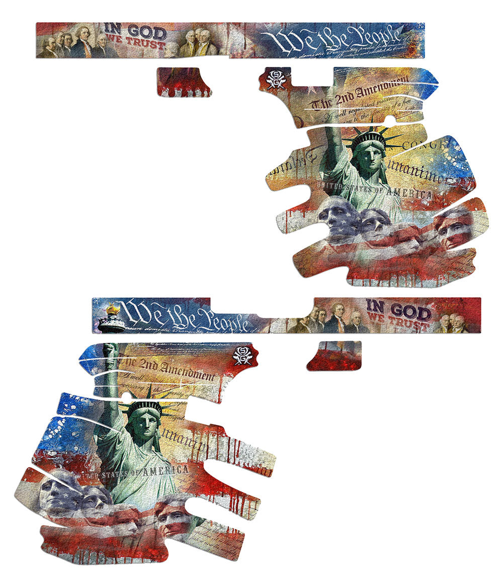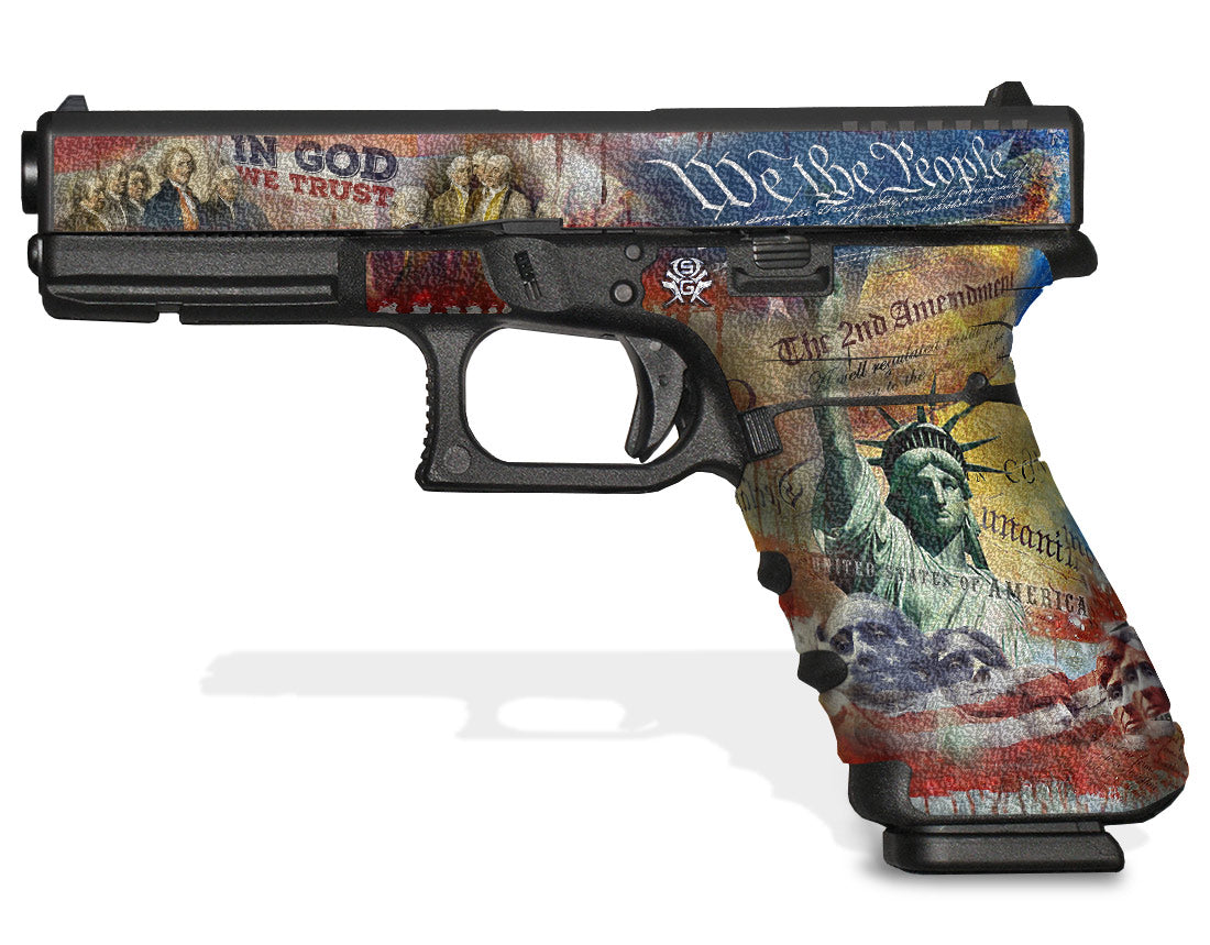 We The People, 2nd Amendment Design Decal Grip for Gen 3 Glock 17 – Stars & Stripes design. Features a textured, rubber-like grip surface to give you a better grip and more control of your Glock. Cover just the frame of your G17, or add grip and design to the slide as well.