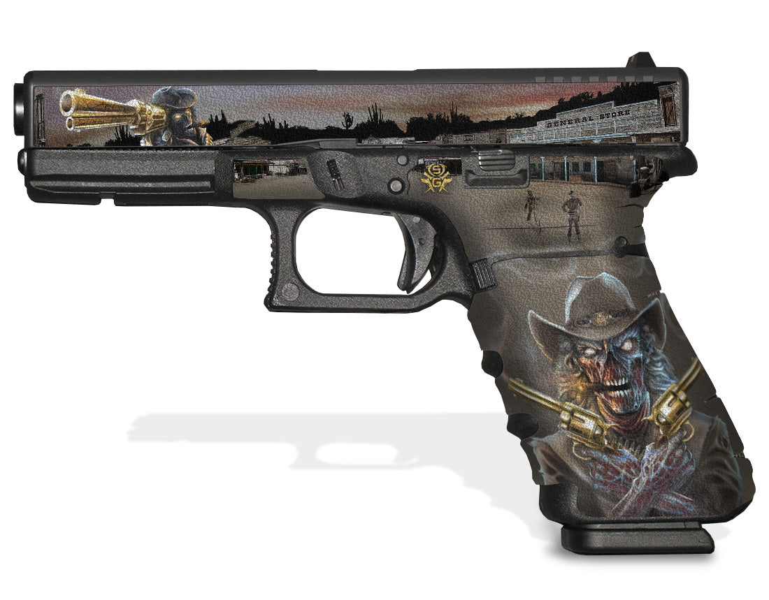 Decal Grip  for Gen 4 Glock 17 – Zombie Outlaw design by Invision Artworks. Features a textured, rubber-like grip surface to give you a better grip and more control of your firearm. Cover just the frame or add grip and design to the slide as well.