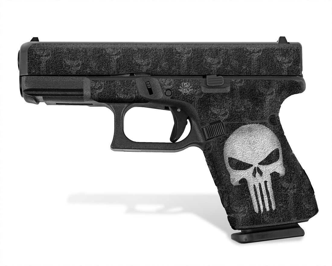 Decal Grip for Gen 5 Glock 19 – Featuring The Punisher design, a textured, rubber-like grip surface to give you a better grip and more control of your Glock. Cover just the frame of your G19 or apply it to your slide as well.