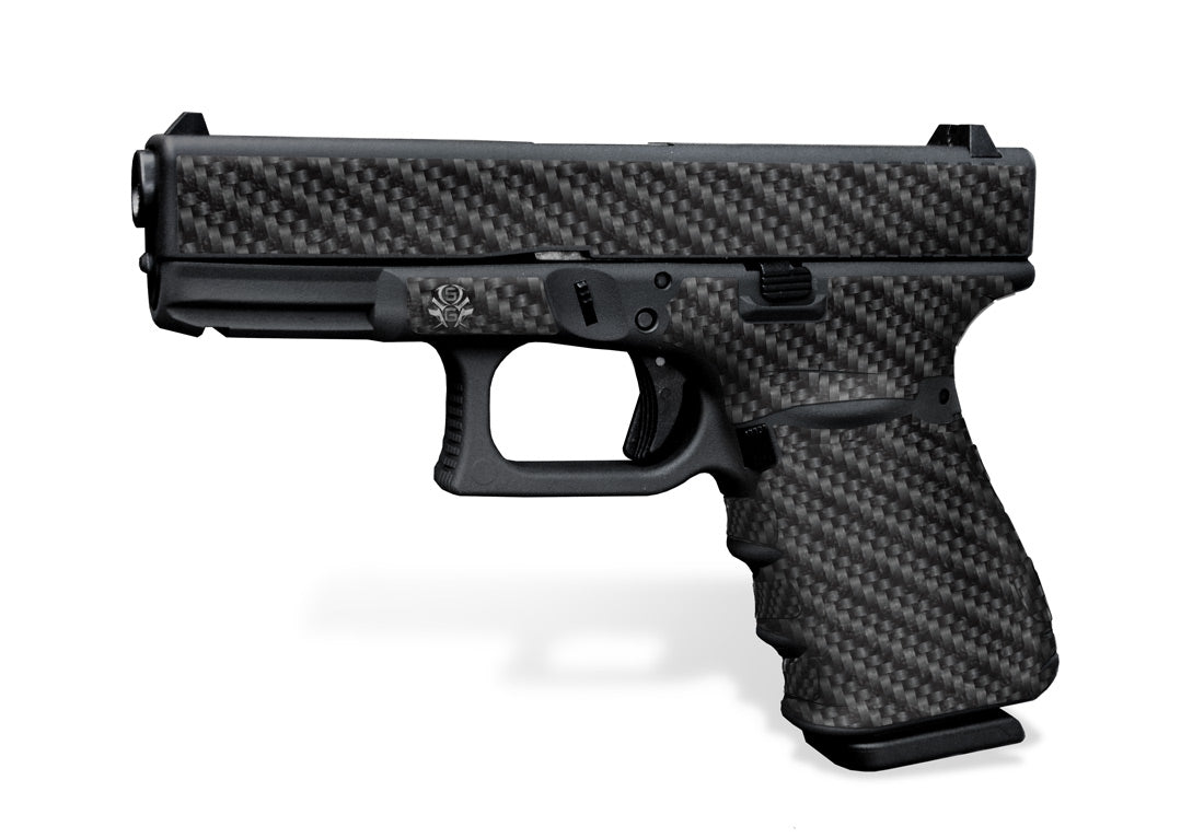 Decal Grip for Glock 19 – Carbon Fiber design. Features a textured, rubber-like surface to give you a better grip and more control of your firearm. Cover just the frame of your G19 or add grip and design to the slide also.