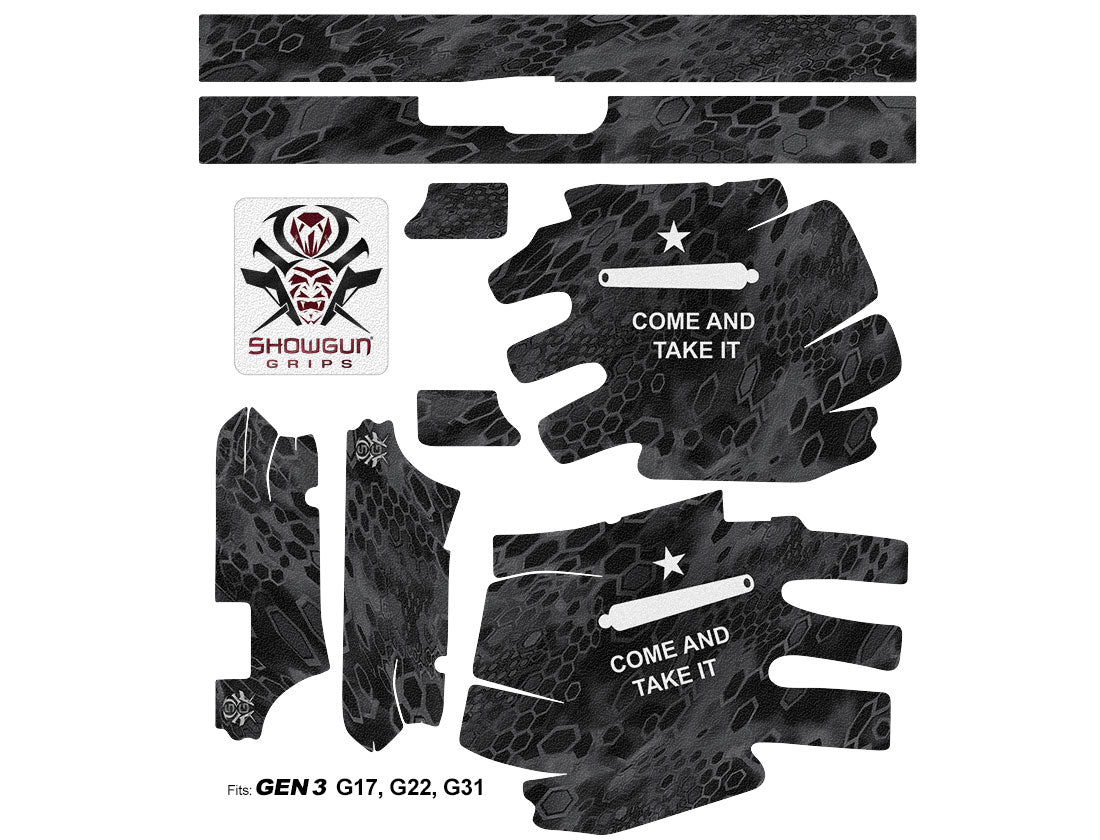 Decal Grip for Glock 22 – Come and Take It design. Features a textured, rubber-like surface to give you a better grip and more control of your firearm. Cover just the frame of your G22 or add grip to your slide also.