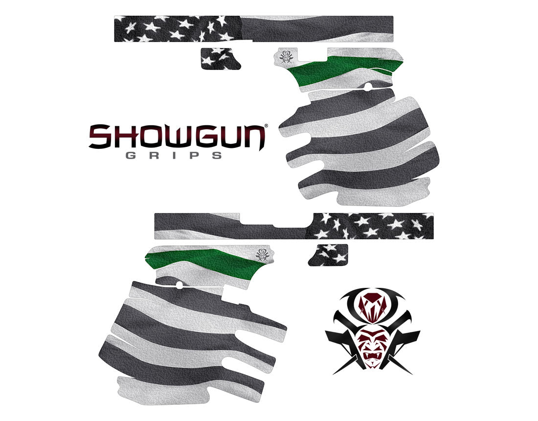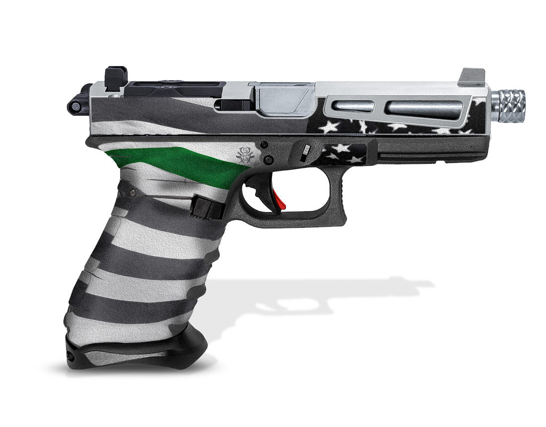 Decal Grip Kit for Glock Gen-3 G22 – Thin Green Line – Show your support for our U.S. Border Patrol Agents, Park Rangers, Game Wardens and Conservation Personnel! These tactical grip graphics feature a textured, rubber-like grip surface to give you a better grip and more control of your firearm. Cover just the frame of your Glock 22 or add grip and design to the slide as well.