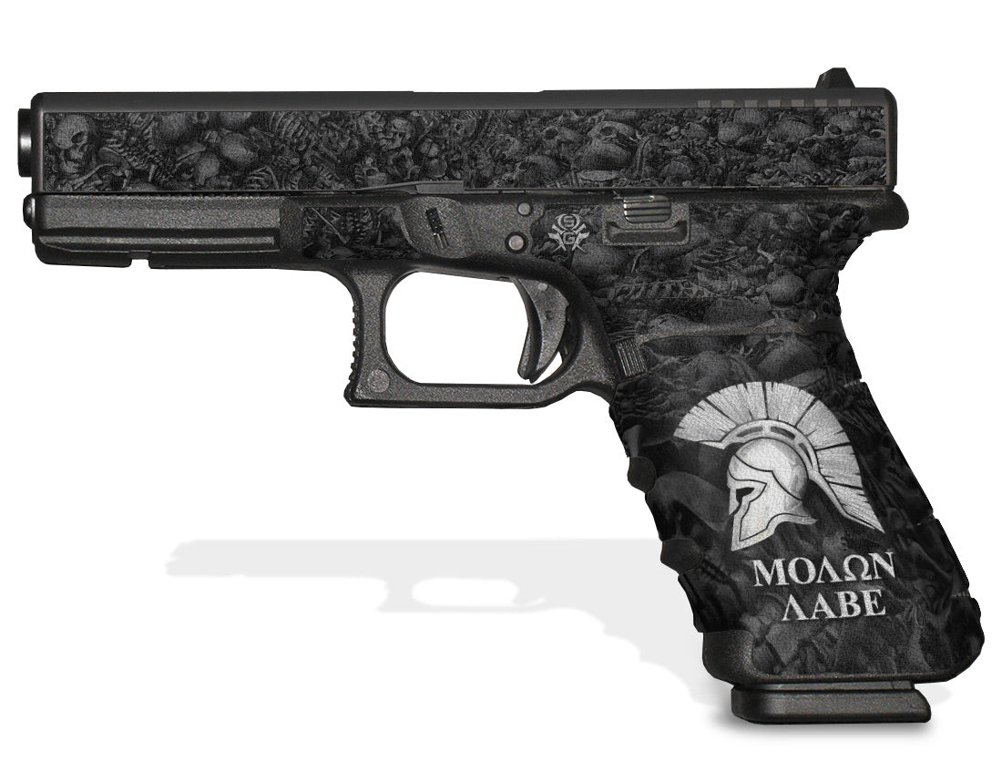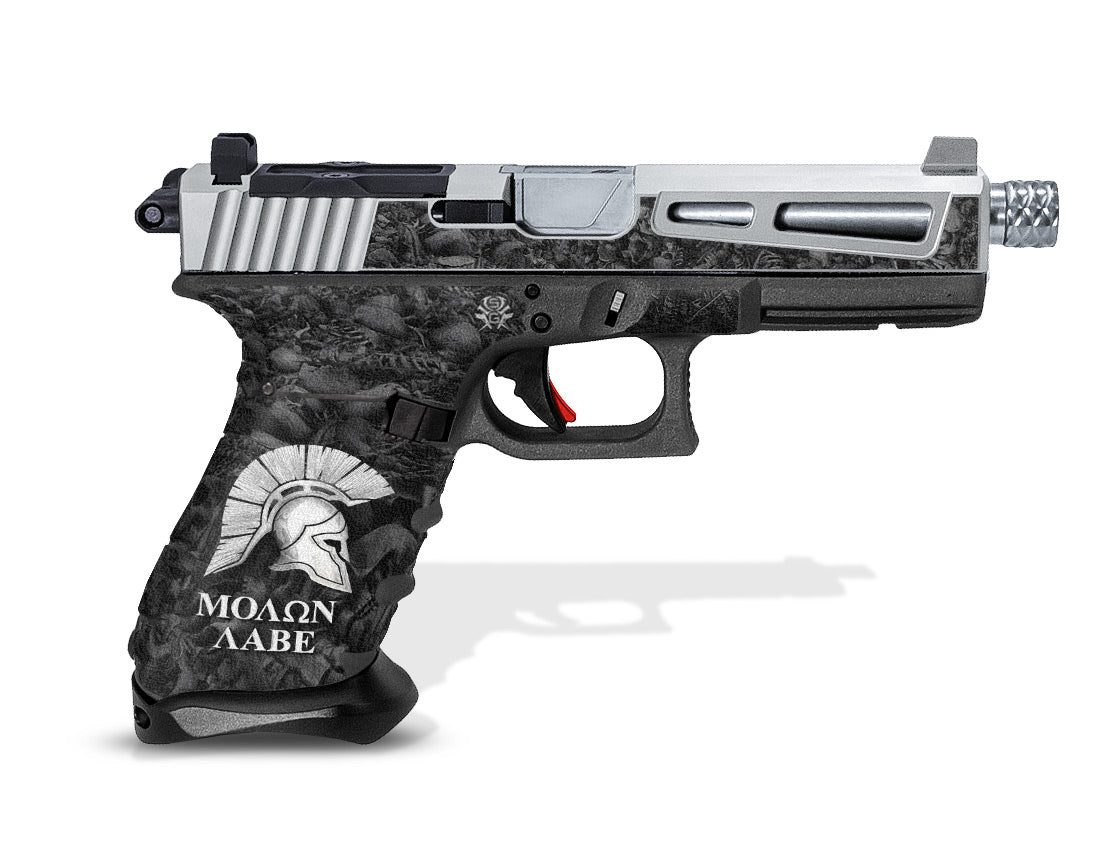 Decal Grip for Gen 4 Glock 22 – Molon Labe / Sparta design. Features a textured, rubber-like grip surface to give you a better grip and more control of your firearm. Cover just the frame or add grip and design to the slide of your G22 as well.