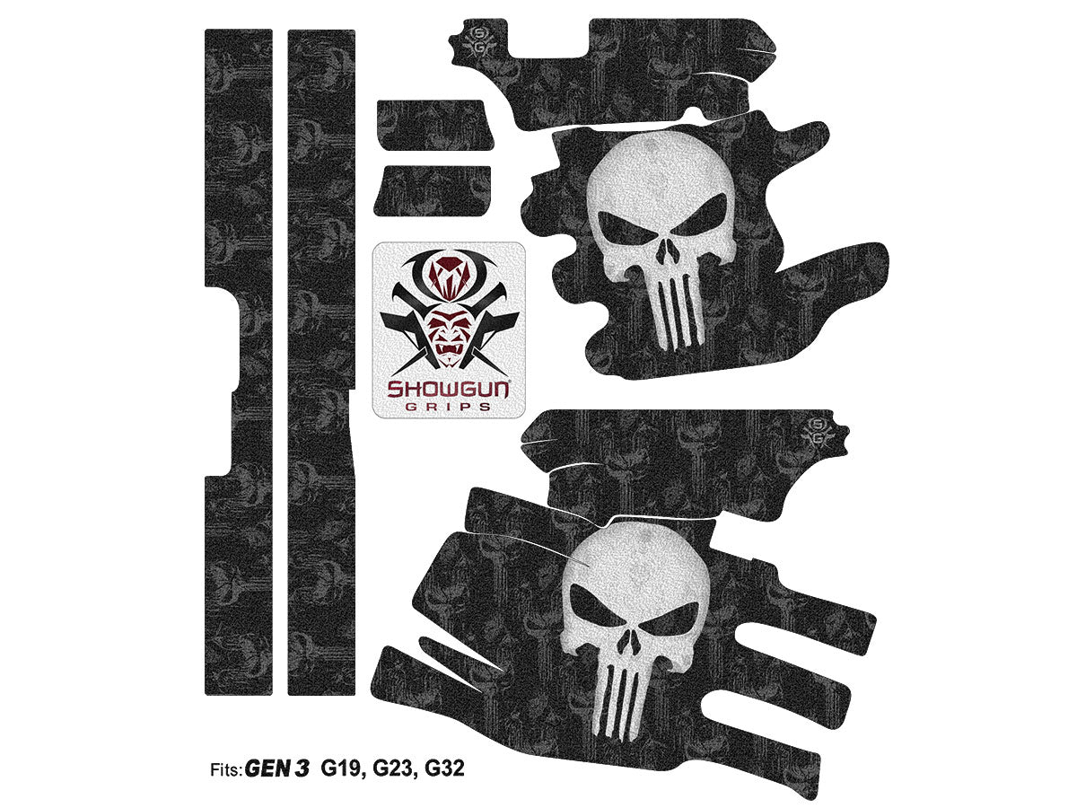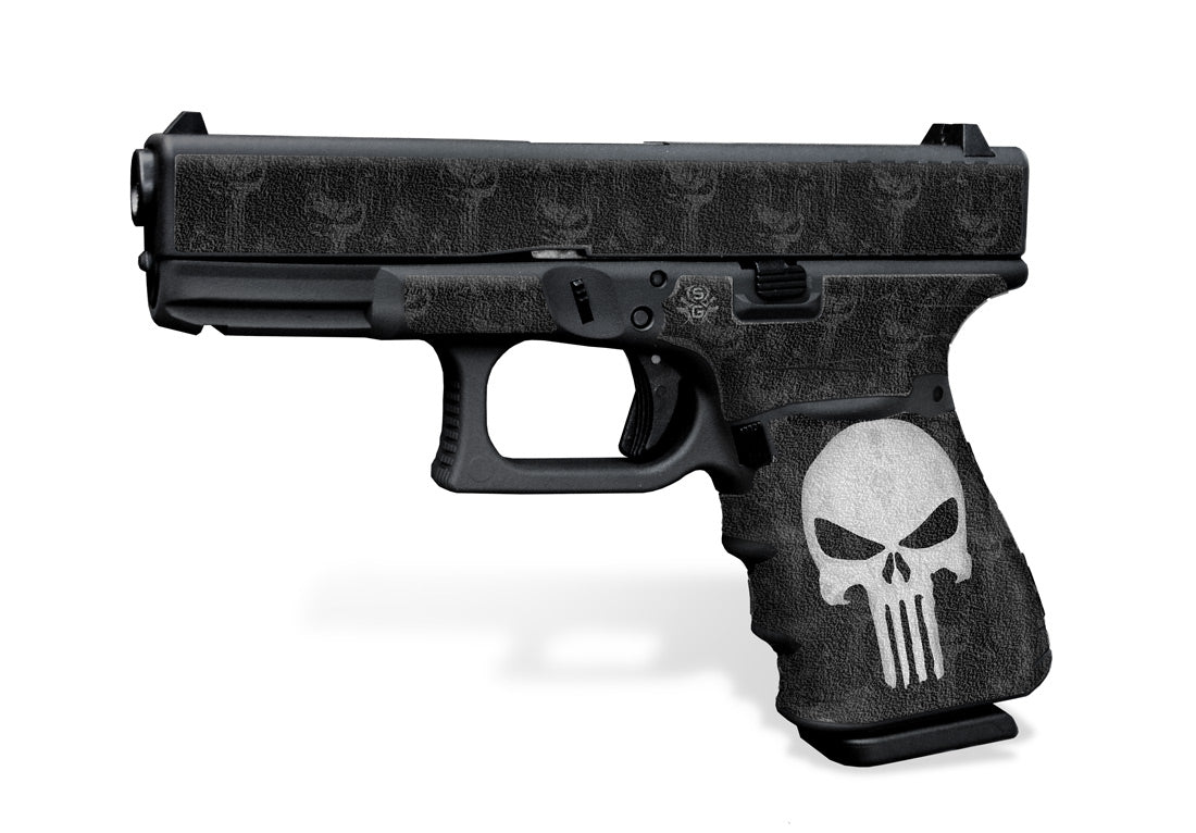 The Punisher Decal Grip Kit for Glock 23 – Features a textured, rubber-like grip surface to give you a better grip and more control of your firearm. Easy, do-it-yourself installation. Cover just the frame or add grip and design to the slide of your Gen-3 G23 also.