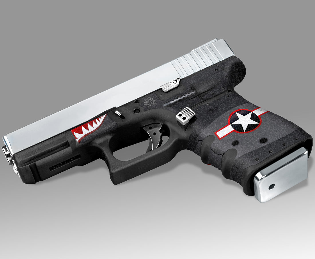 Decal Grip for Gen 3 Glock 23 – War Machine design by Invision Artworks. Features a textured, rubber-like surface to give you a better grip and more control of the firearm. Easy, do-it-yourself installation. Cover just the frame of your G23 or add grip and design to the slide as well.