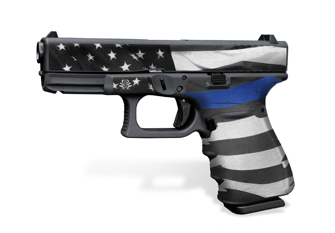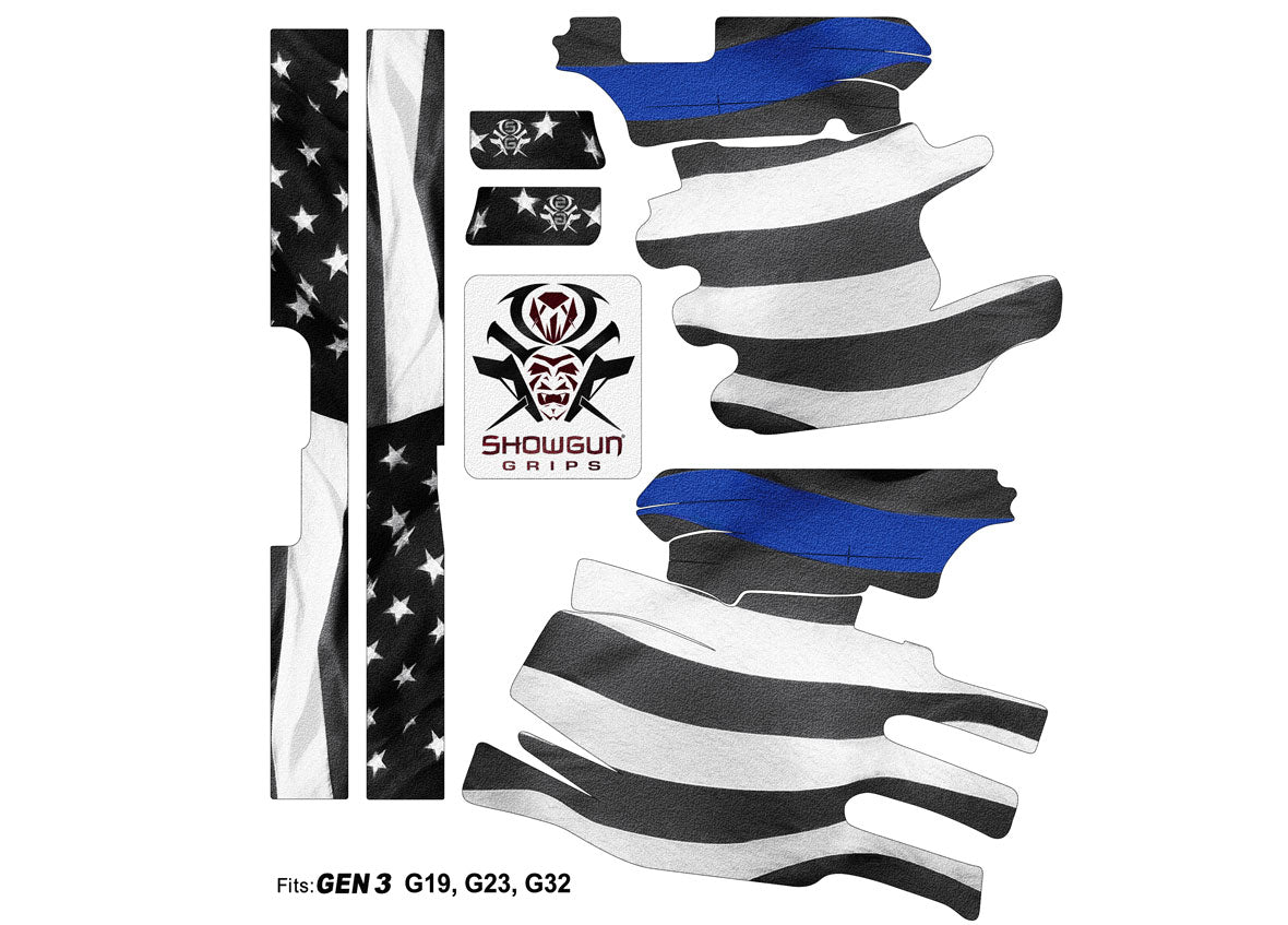 Decal Grip for Gen 3 G23 – Thin Blue Line design. Features a textured, rubber-like surface to give you a better grip and more control of the firearm. Cover just the frame of your Glock 23 or add grip and design to the slide as well. Easy, do-it-yourself installation.