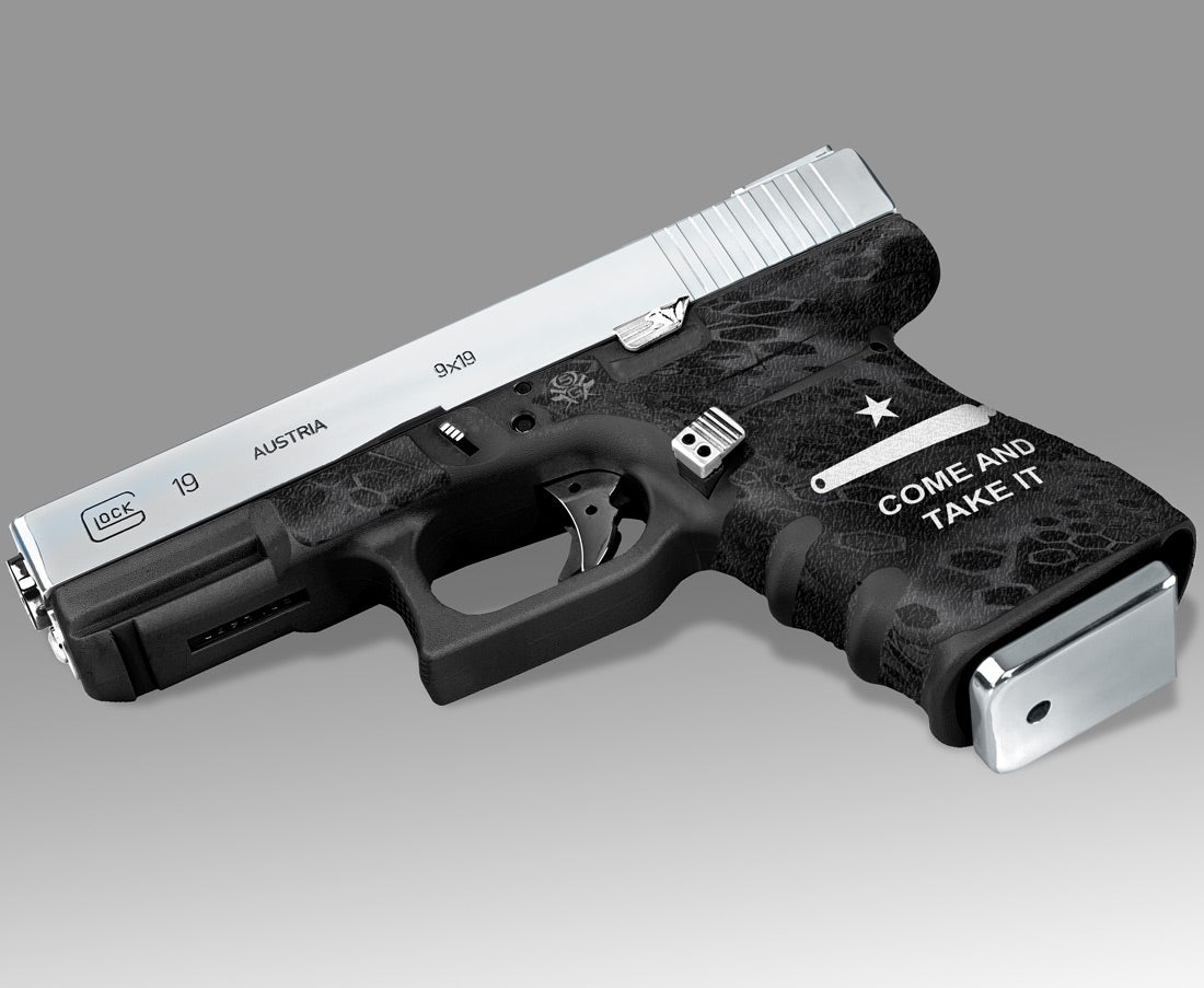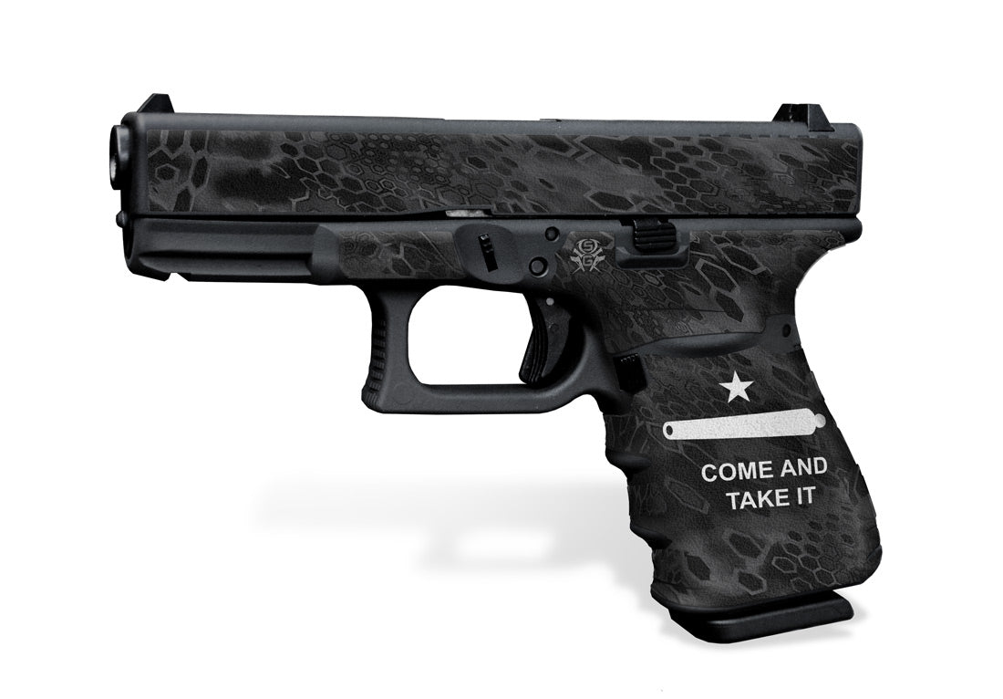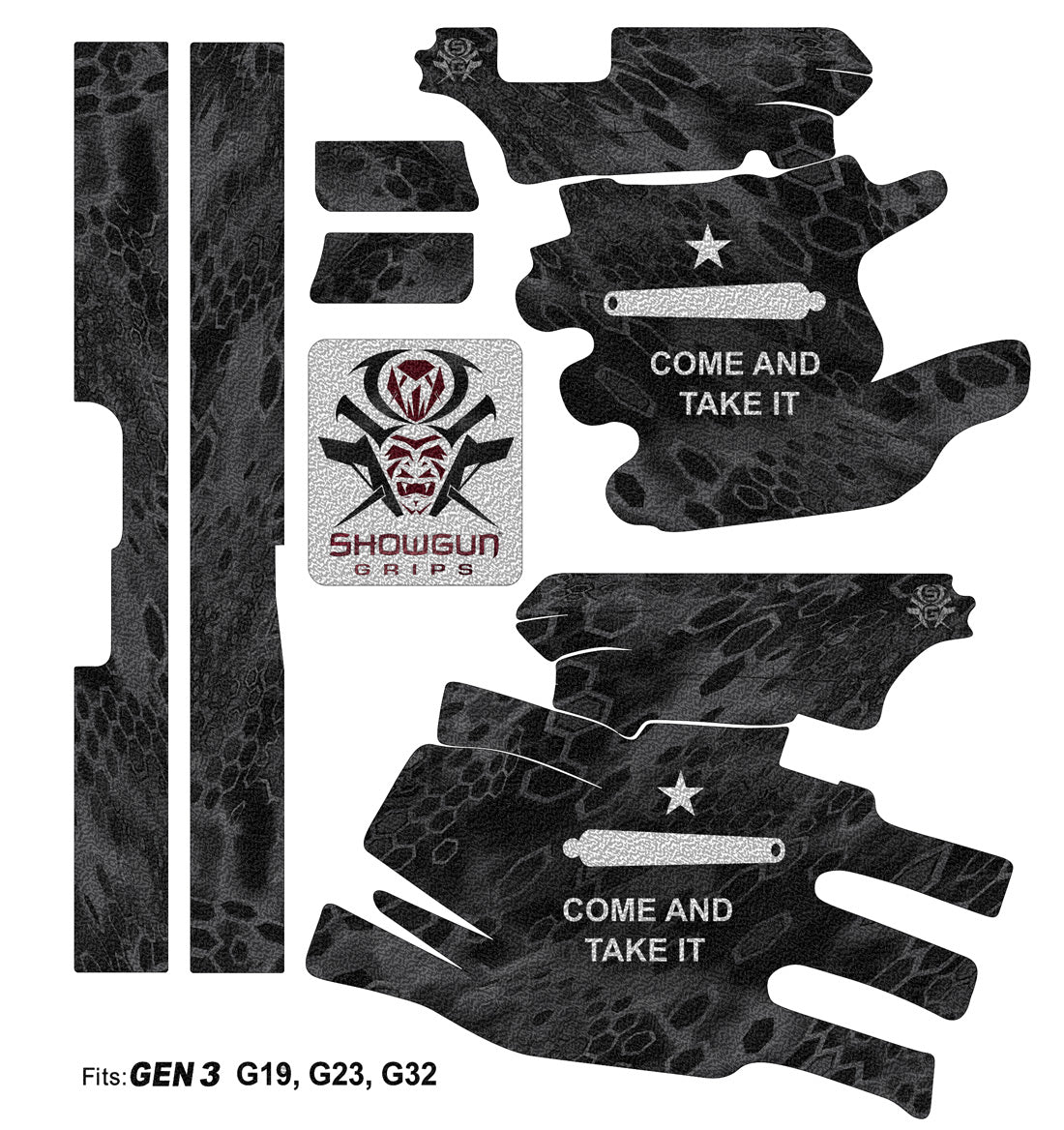 Decal Grip for Glock 23 – Come and Take It design. Features a textured, rubber-like surface to give you a better grip and more control of your firearm. Cover just the frame of your G23 or add grip and design to the slide as well.