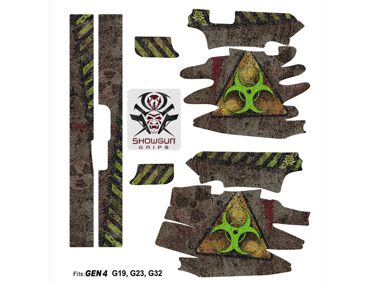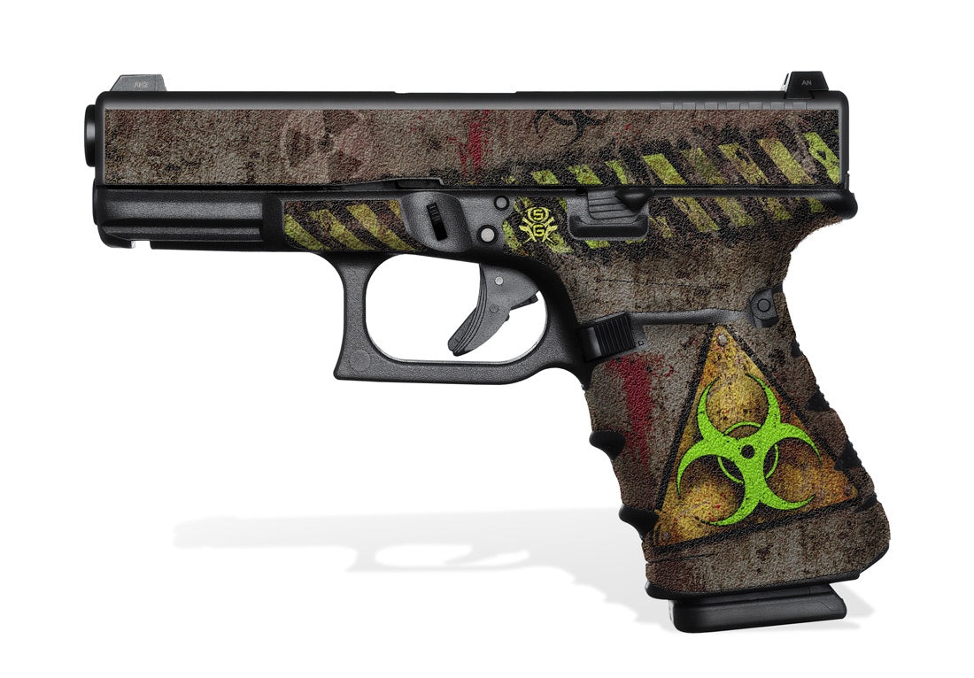 Decal Grip Kit for Glock Gen 4, G23 – Features Biohazard artwork and a textured, rubber-like grip surface to give you a better grip and more control of your firearm. Cover just the frame or add grip and design to the slide of your Glock 23 as well.