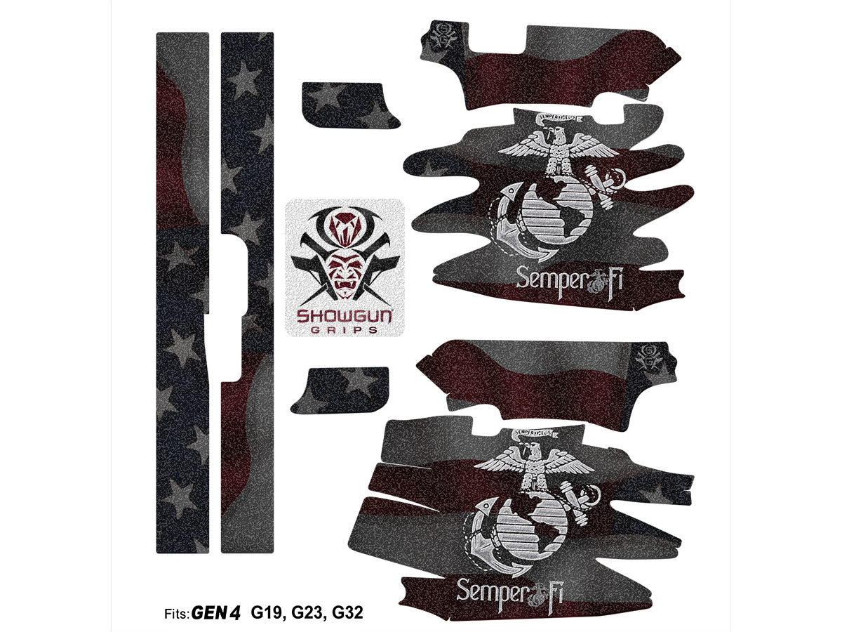 Decal Grip for Glock 23, Gen 4 – Semper Fi design by Invision Artworks. Features a textured, rubber-like grip surface to give you a better grip and more control of your firearm. Cover just the frame or add grip and design to the slide of your Glock 23 as well.