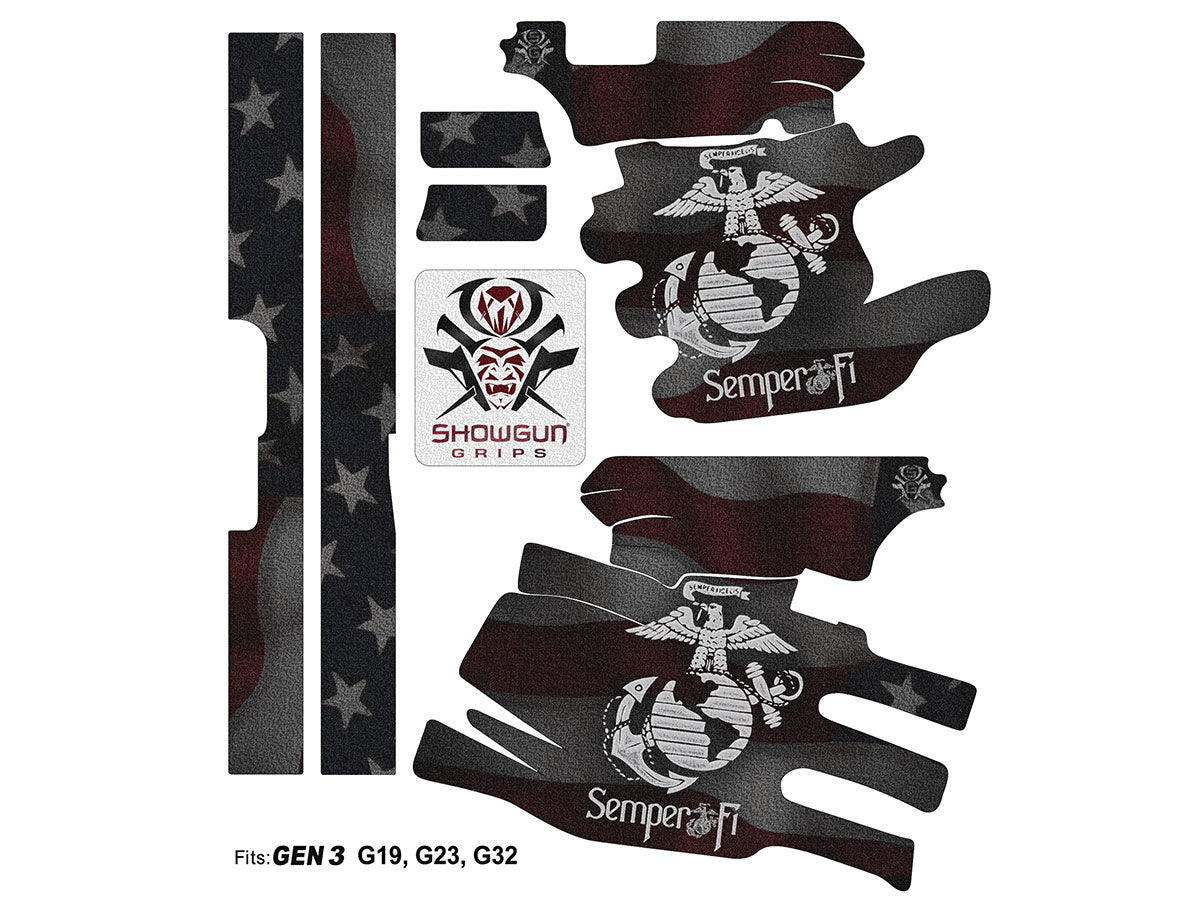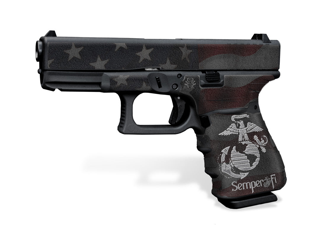 Decal Grip Kit for Glock Gen-3 G23 – Semper Fi design by Invision Artworks. Features a textured, rubber-like grip surface to give you a better grip and more control of your firearm. Cover just the frame or add grip and design to the slide of your Glock 23 as well.