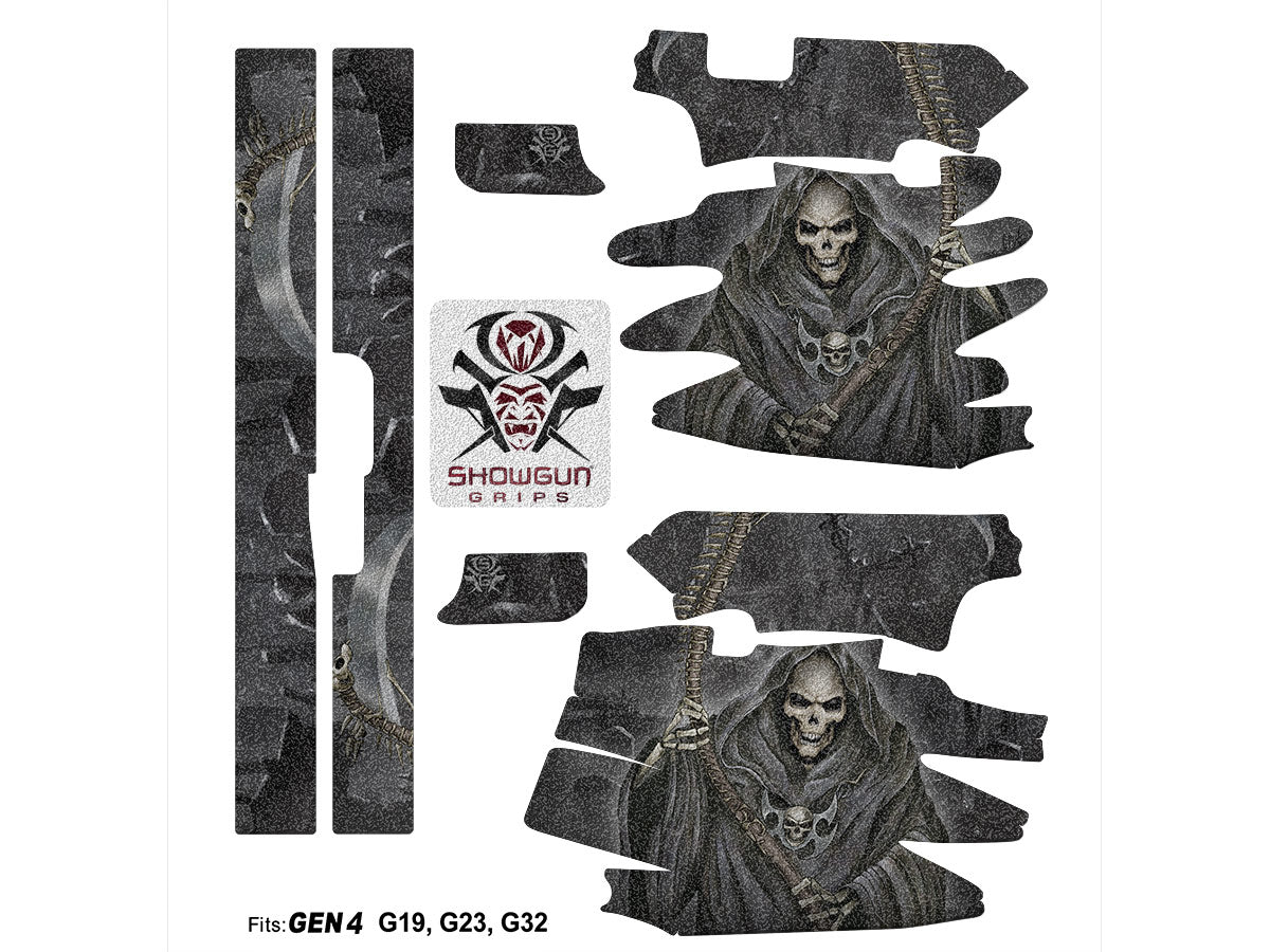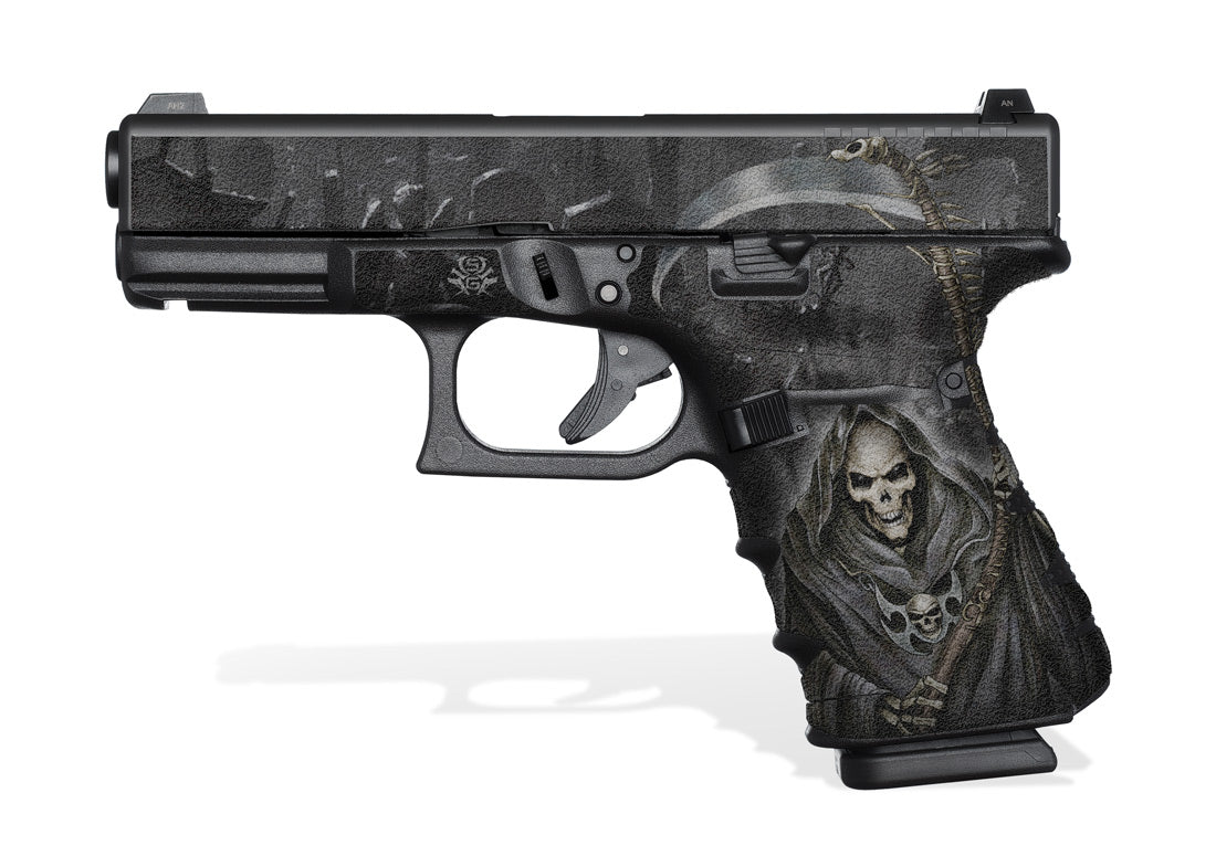 Graphics Decal Grip for Gen 4, Glock 23 – Grim Reaper design. Features a textured, rubber-like surface to give you a better grip and more control of your firearm. Cover just the frame of your G23 or add grip to the slide as well.