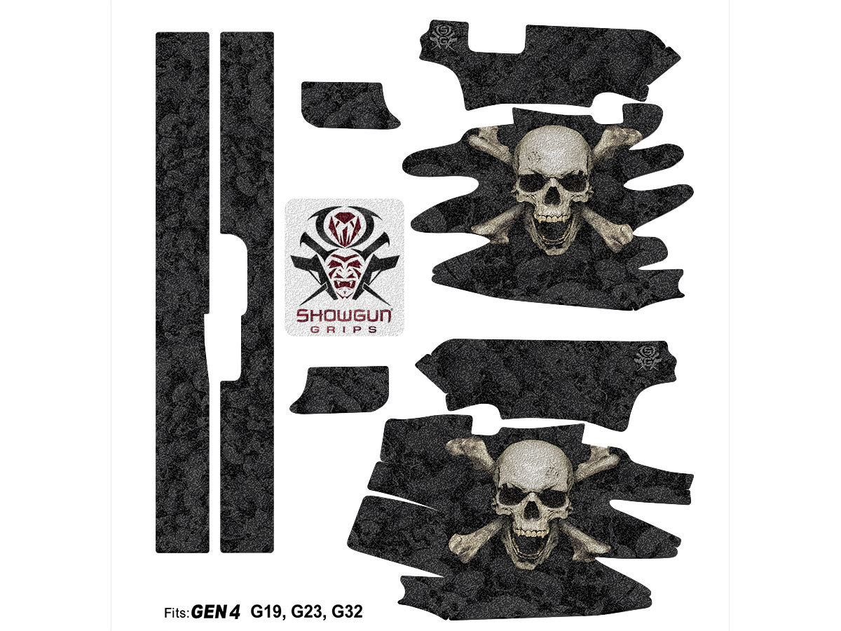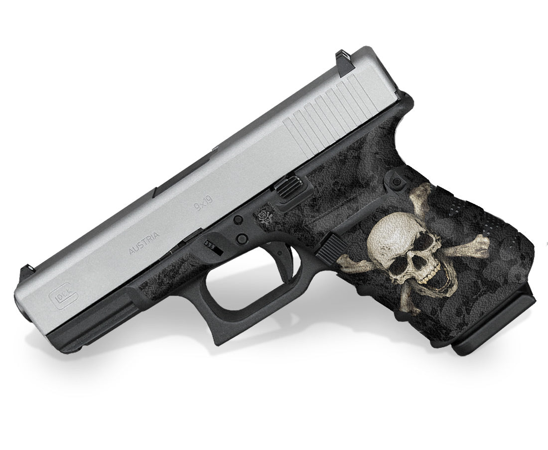 Decal Grip Kit for Glock Gen 4 G23 – Skull & Crossbones design by Invision Artworks. Features a textured, rubber-like grip surface to give you a better grip and more control of your firearm. Cover just the frame or add grip and design to the slide of your Glock 23 as well.