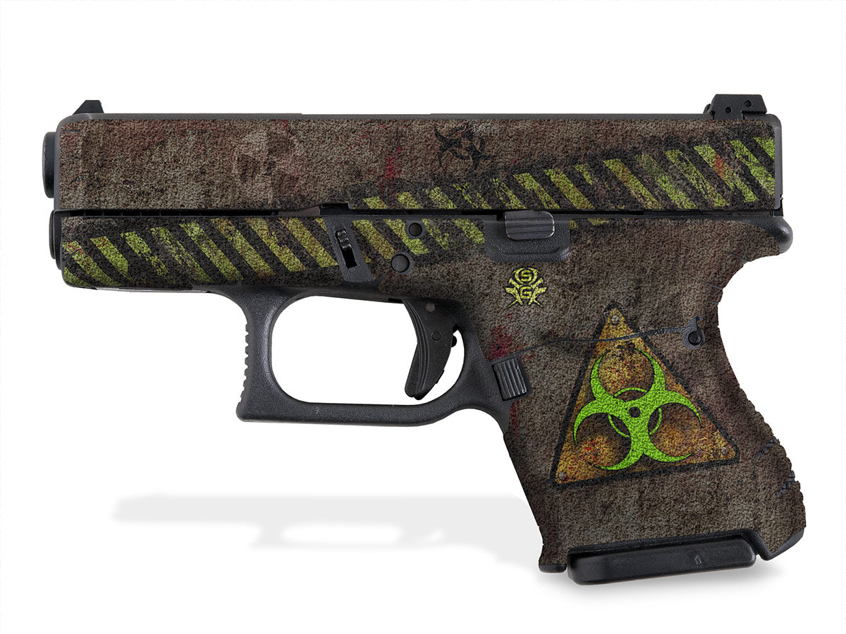 Decal Grip Kit for  Glock 26 – Biohazard design. Provides a better grip on the short frame of the G26, giving you more control. Features a textured, rubber-like grip surface. Cover just the frame or add grip the slide as well.