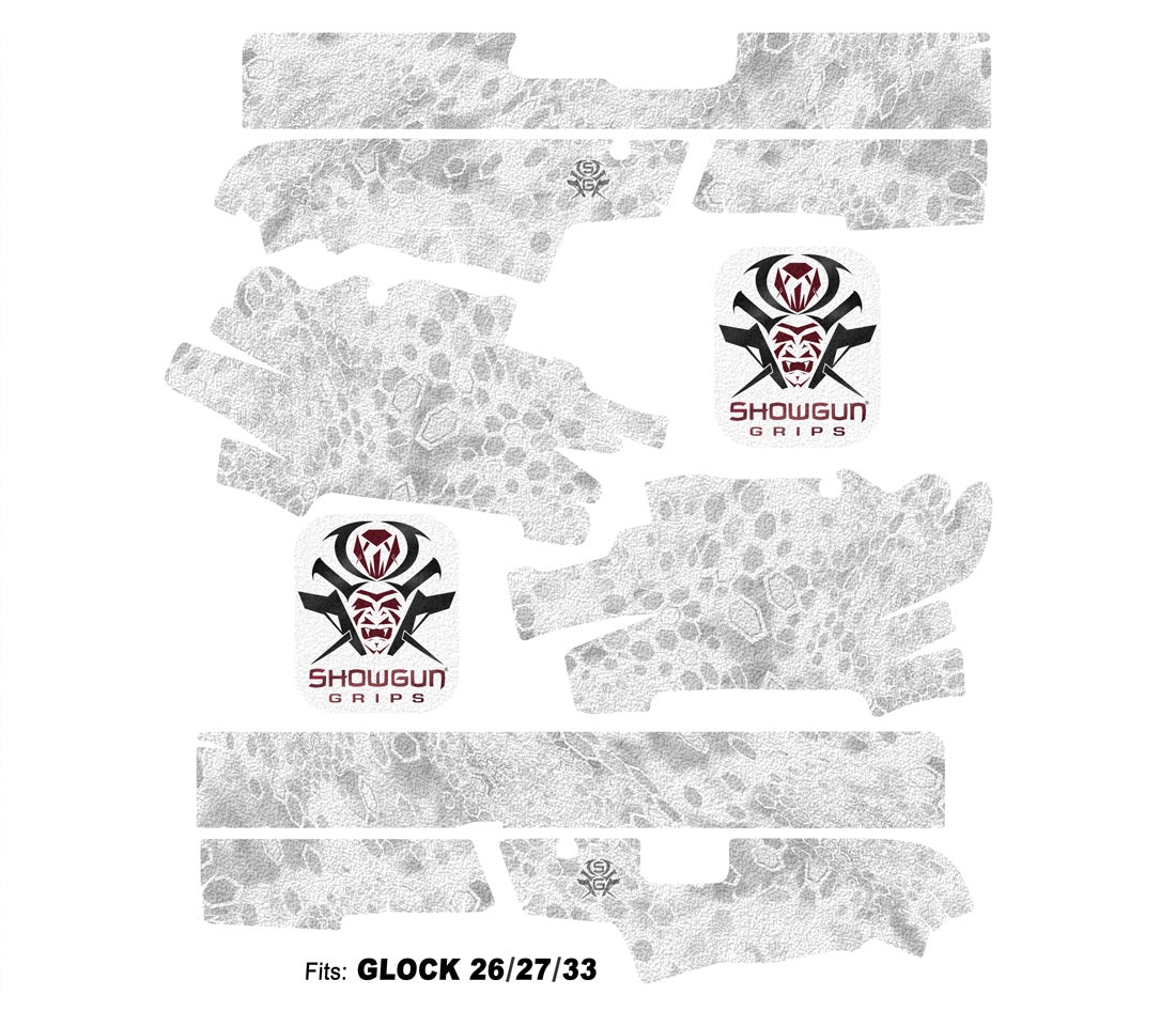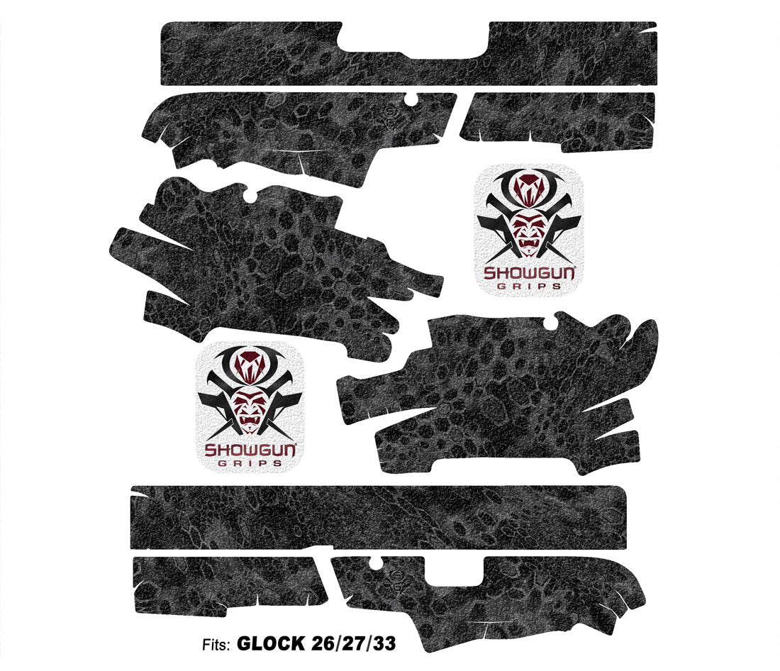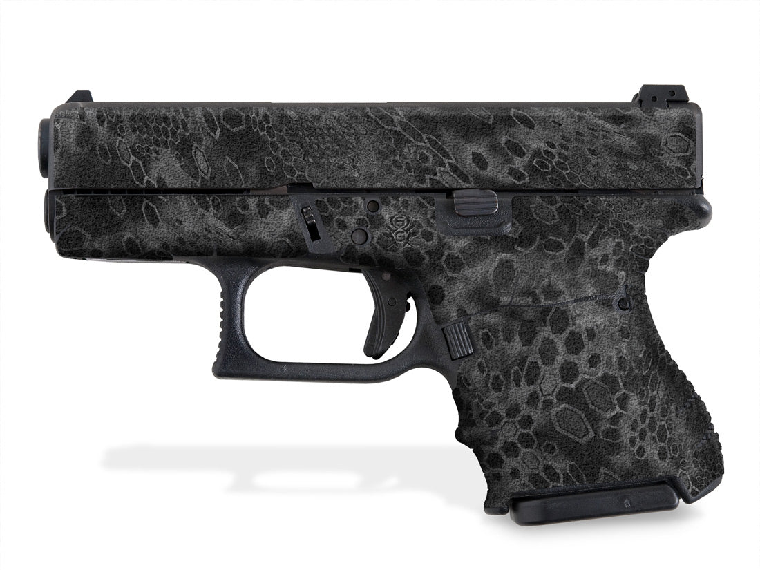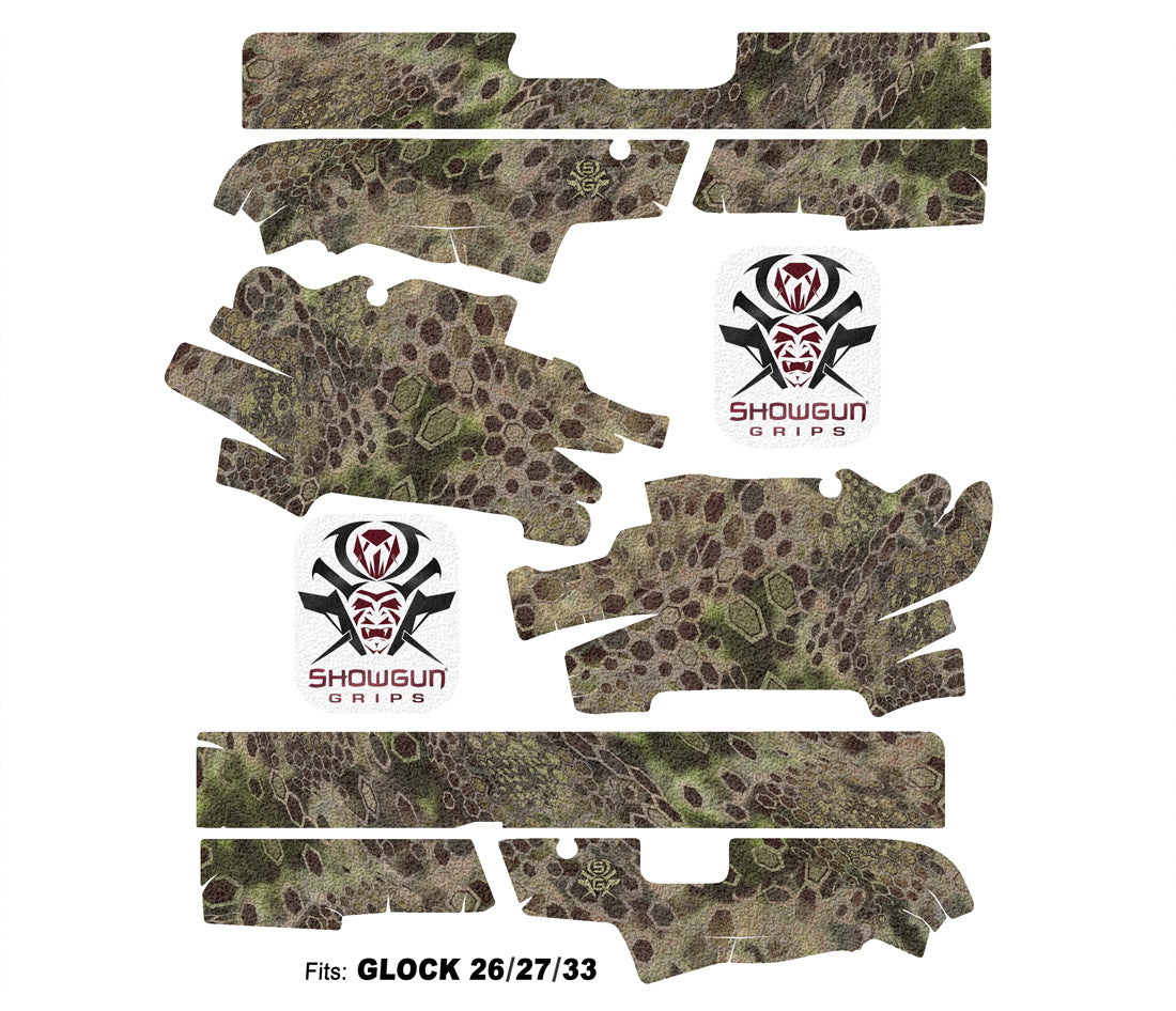 Decal Grip Kit for G26 – Cryptic Camo design. Provides a better grip on the short frame of the Glock 26, giving you more control. Features a textured, rubber-like grip surface. Cover just the frame or add grip the slide as well.