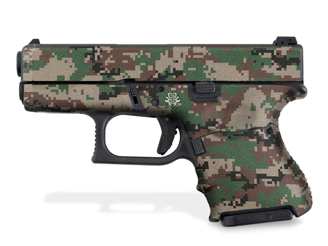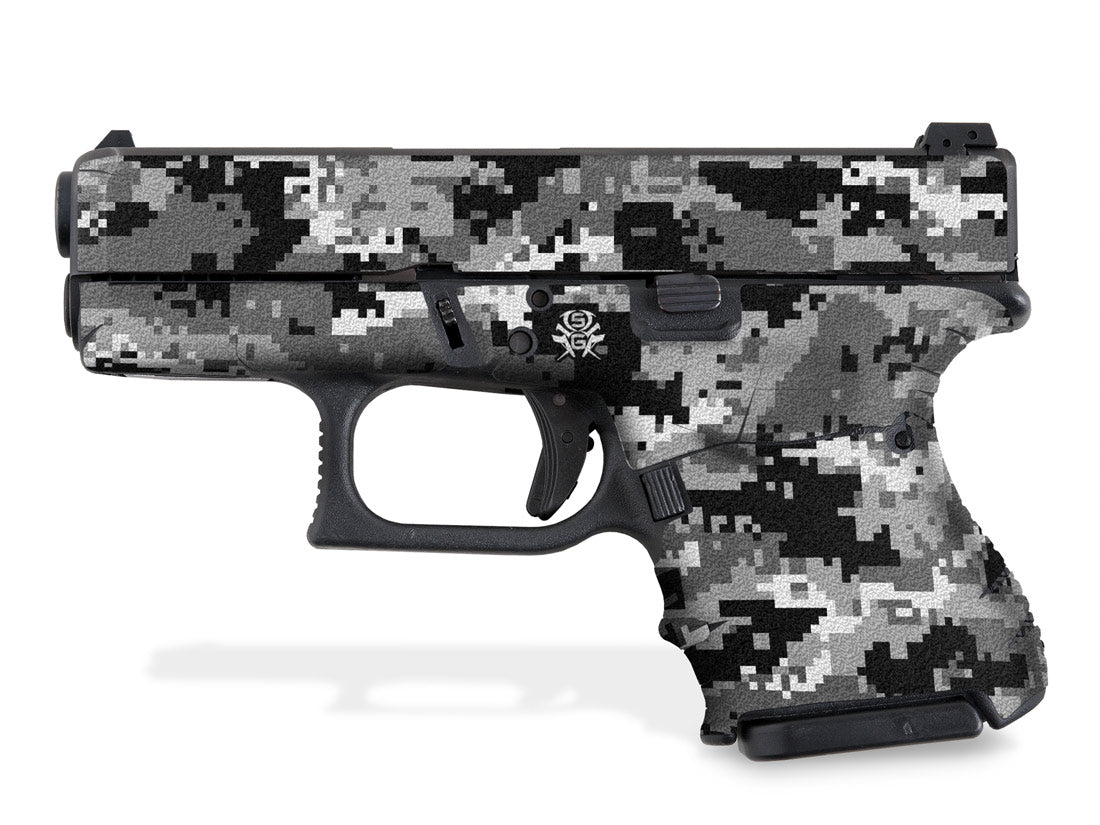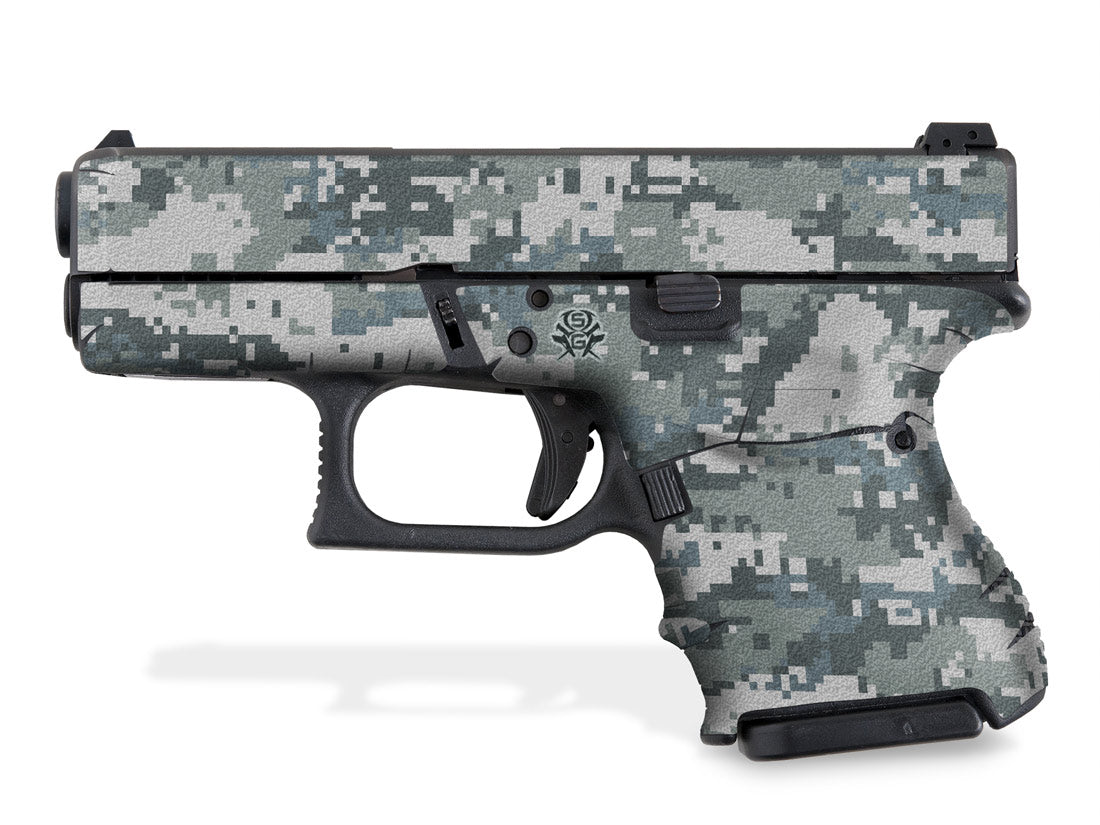 Decal Grip Kit for G26 – Digital Camo design. Provides a better grip on the short frame of the Glock 26, giving you more control. Features a textured, rubber-like grip surface. Cover just the frame or add grip the slide as well.