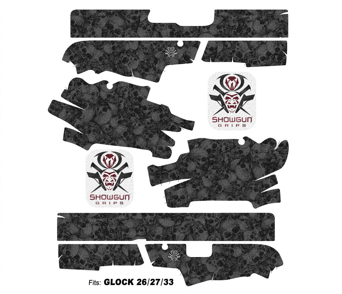 Decal Grip Kit for Glock 26 – Skull Collector design. Provides a better grip on the short frame of the G26, giving you more control. Features a textured, rubber-like grip surface. Cover just the frame or add grip the slide as well.