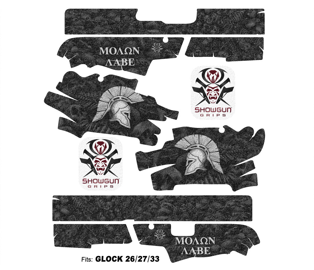 Decal Grip Kit for Glock 26 – Sparta / Molon Labe design. Provides a better grip on the short frame of the G26, giving you more control. Features a textured, rubber-like grip surface. Cover just the frame or add grip the slide as well.