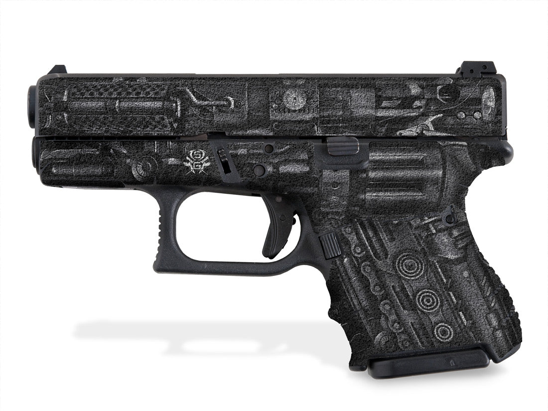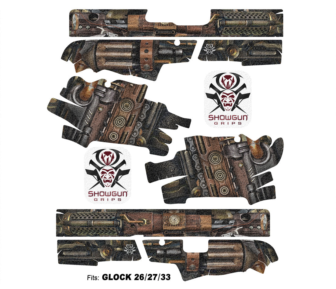 Decal Grip Kit for Glock 26 – Steampunk design. Provides a better grip on the short frame of the G26, giving you more control. Features a textured, rubber-like grip surface. Cover just the frame or add grip the slide as well.