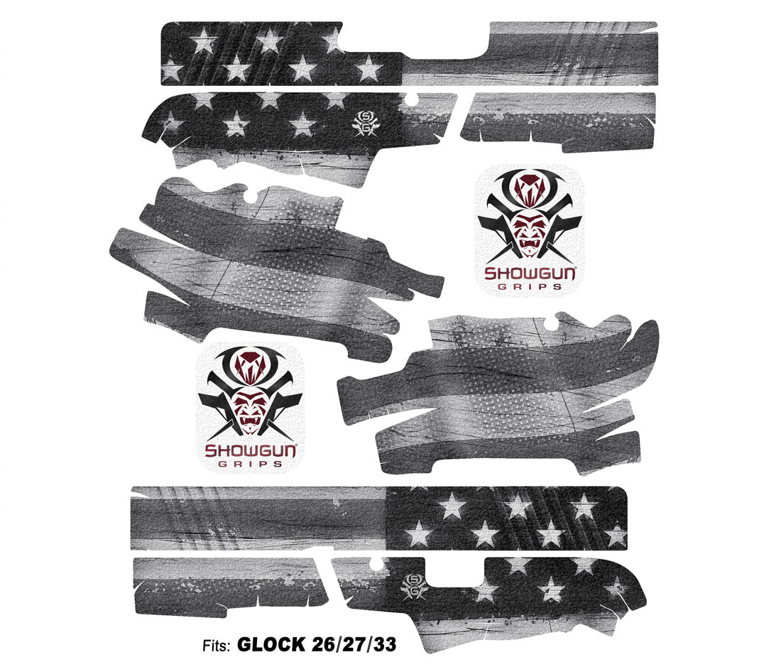 Decal Grip Kit for Glock 26 – Subdued flag design. Provides a better grip on the short frame of the G26, giving you more control. Features a textured, rubber-like grip surface. Cover just the frame or add grip the slide as well.