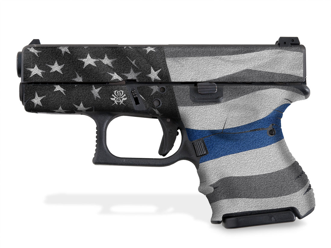 Decal Grip Kit for Glock 26 – Thin Blue Line design. Support our Law Enforcement Officers while adding a tactical benefit… these decal grips feature a  rubber-like, textured surface to give you a better grip on the short frame of the G26. Cover just the frame or add grip the slide as well.