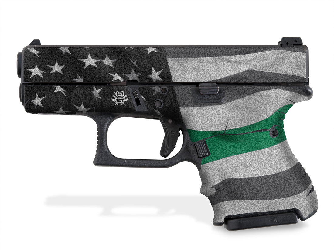 Decal Grip Kit for Glock 26 – Thin Green Line  design.  Show your support for our U.S. Border Patrol Agents, Park Rangers, Game Wardens and Conservation Personnel!  while adding a tactical benefit… these decal grips feature a rubber-like, textured surface to give you a better grip on the short frame of the G26. Cover just the frame or add grip the slide as well.