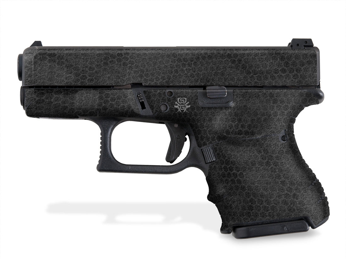 Decal Grip Kit for Glock 27 Gen 3 and Gen 4 –  Digital Snakeskin design. Provides a better grip on the short frame of the G27, giving you more control. Features a textured, rubber-like grip surface. Cover just the frame or add grip the slide as well.