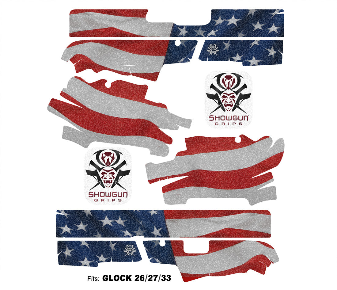 Decal Grip Kit for G27 Gen 3 or Gen 4 – Stars & Stripes design. Provides a better grip on the short frame of the Glock 27, giving you more control. Features a textured, rubber-like grip surface. Cover just the frame or add grip the slide as well.